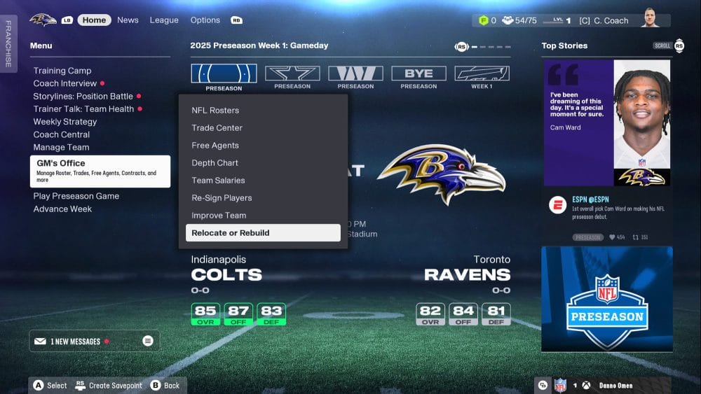 Start up a franchise mode and select any settings and team you would like. Once you get to the main franchise mode page head to the GM Office. From here you will see an option to relocate or rebuild. Select relocate.