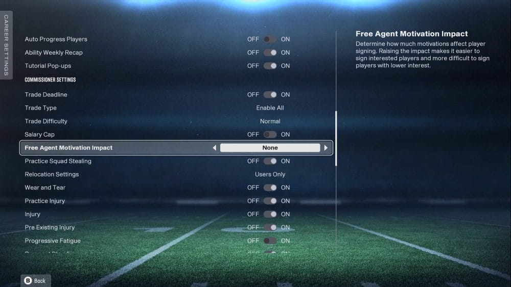 To do so we're going to turn off the salary cap when we create our franchise mode and select any team with a highly rated player. For this we suggest the Washington Commanders as they have WR Terry McLaurin who will be a free agent at the end of the first year and is rated a 94. Go into the settings and turn off the salary cap and change the Free Agent Motivation Impact to none.