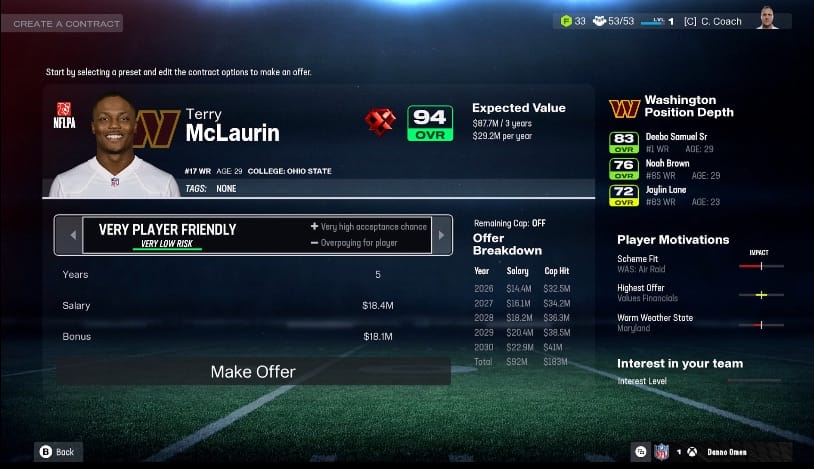 Then start your season and advance your season to week 3. Then head into your NFL rosters section under the GM tab. Find McLaurin and offer him a new contract. Your best bet is to switch it to a "very player friendly" deal. With no salary cap you can make it won't matter much. Should he accept, you will earn the achievement/trophy. If for some reason he doesn't just offer more money.