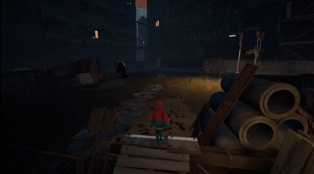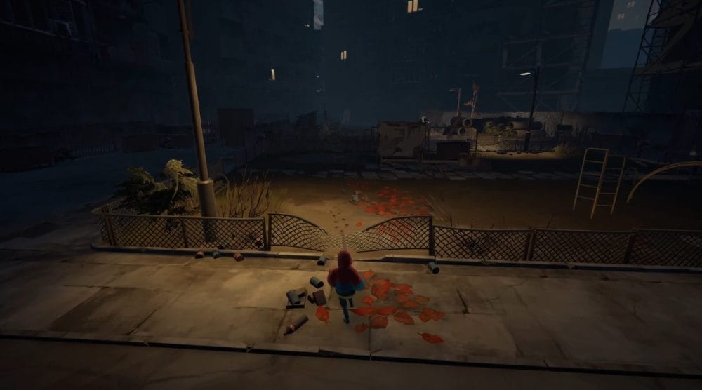 At the beginning of the game, right after approaching the car with its alarm going off, you’ll see streetlamps lighting up broken fences. Follow the tracks through these gaps.