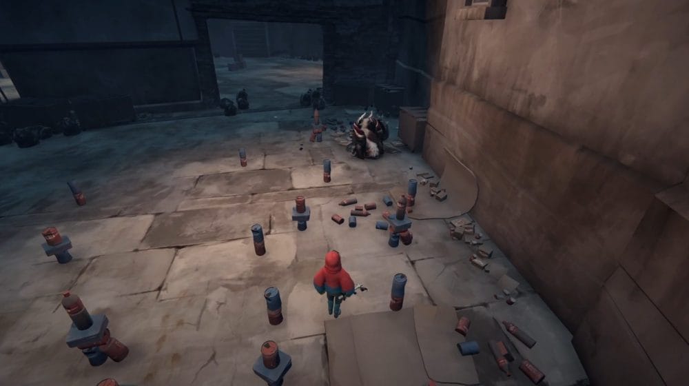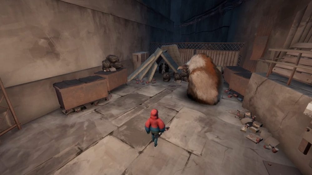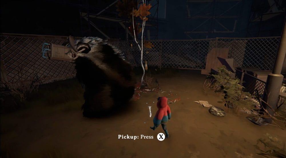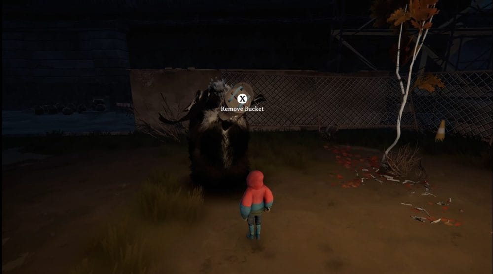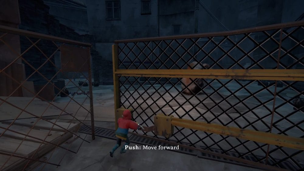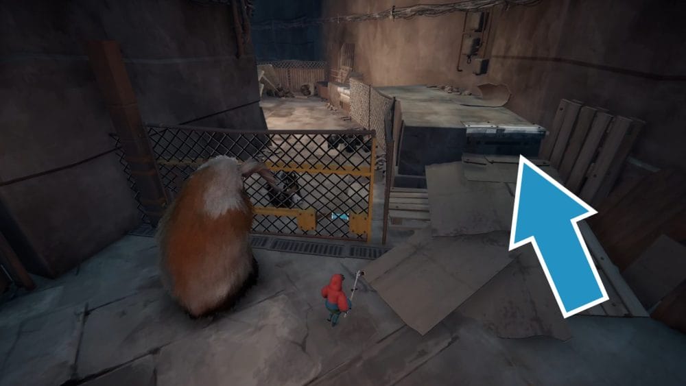 Run down to the other end, and you’ll see the trapped Calicorn run into some trash to hide. Head back up towards the gate and approach the blue bar to push it open.