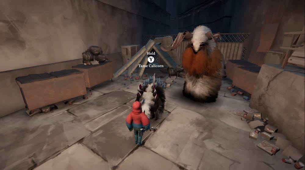 Right after taming the fourth Calicorn, turn around to see a wall that can be pushed by you and your herdling. Approach it, and your new addition will help lower the wall for the rest of your Calicorns to come through.