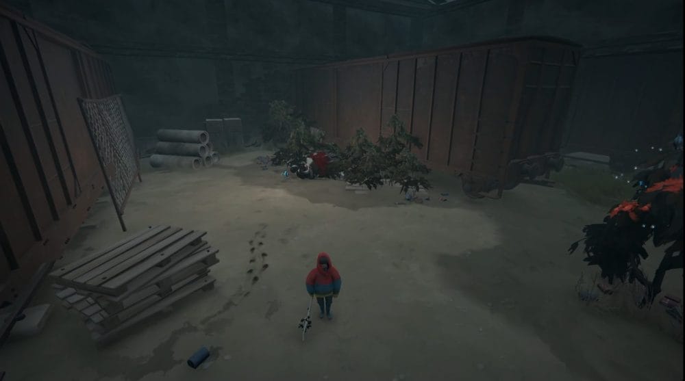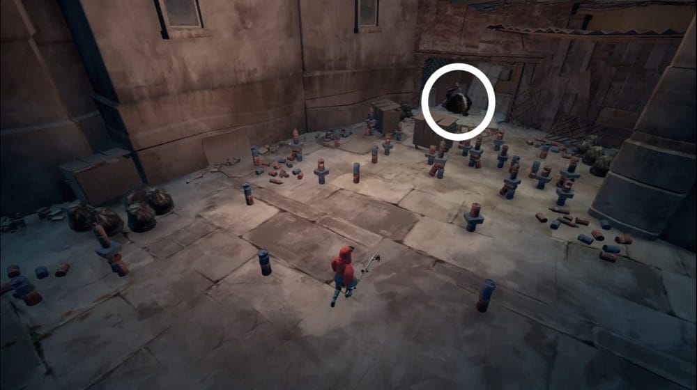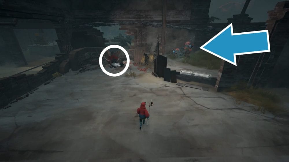 You’ll reach a fenced-in area that can only be entered by a wooden ledge. Drop down and head towards the creature wandering around.
