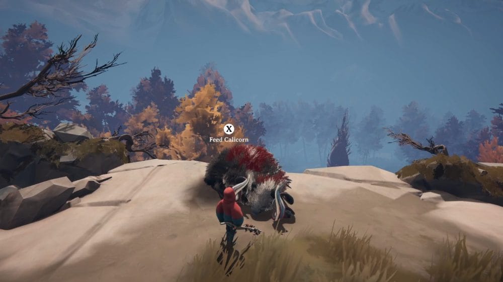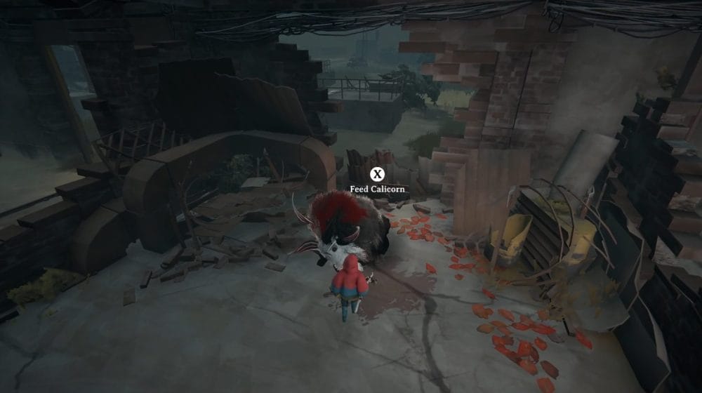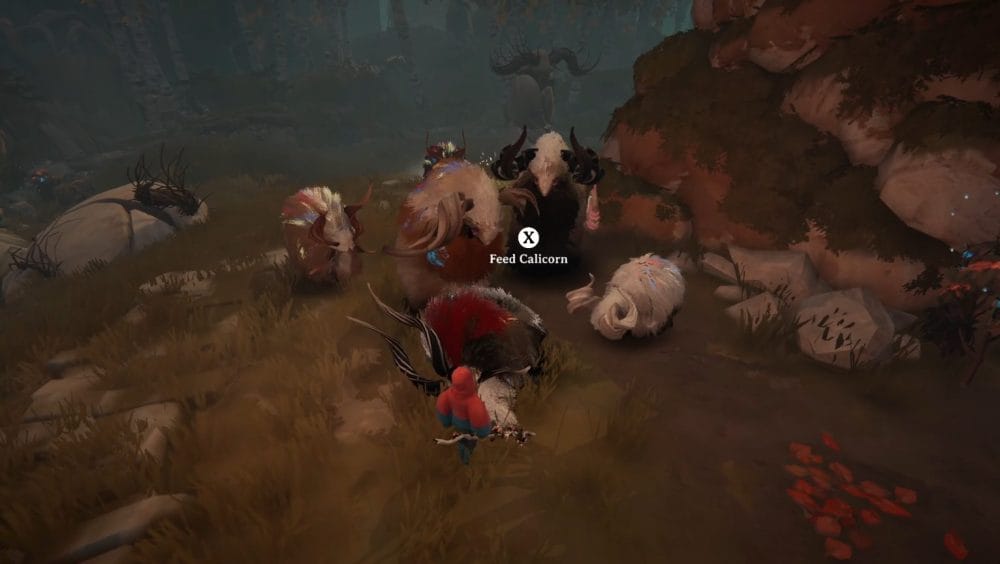 Here, you’ll spot the Calicorn, which needs healing, indicated by the red on its fur. Hop up the ledge and grab some food from the plants.