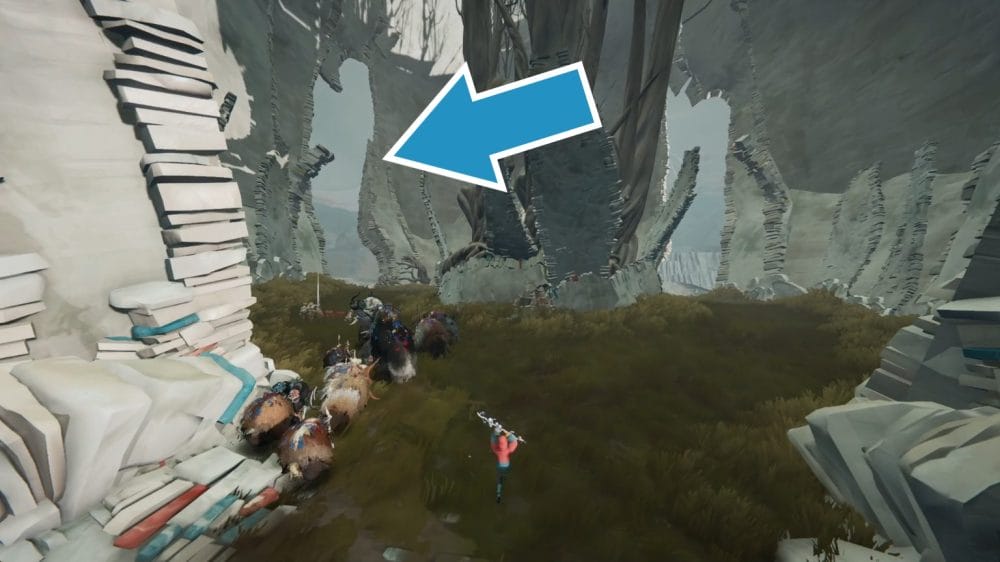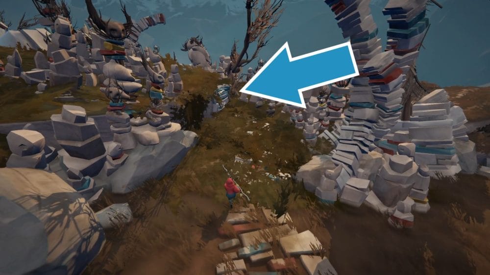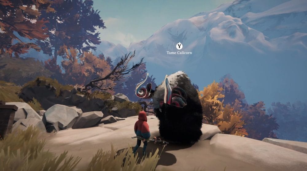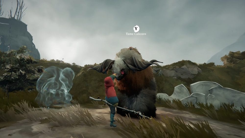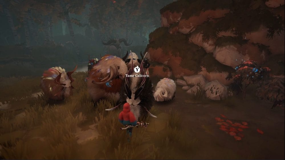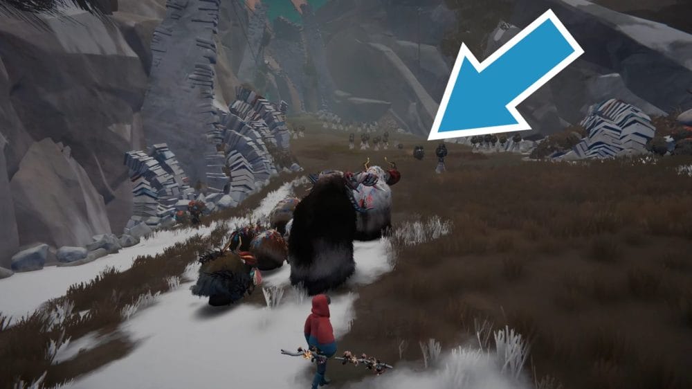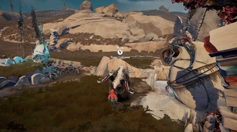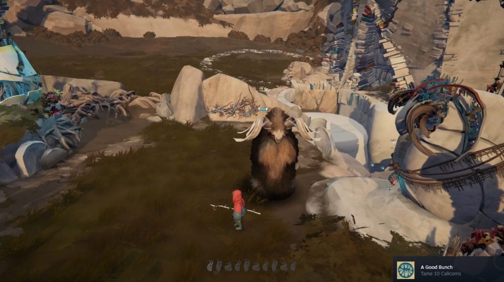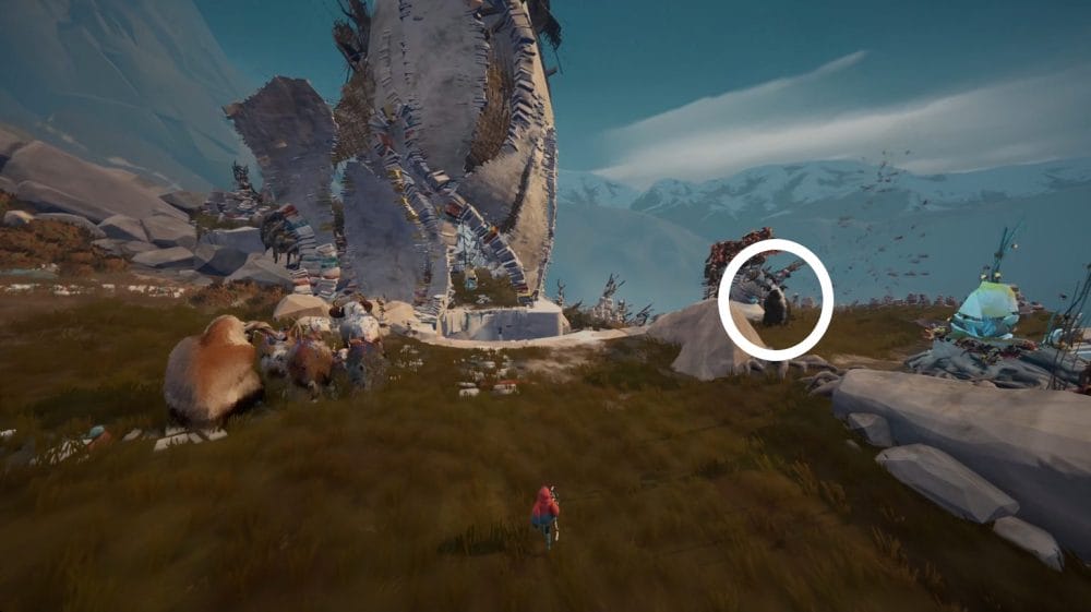 Later on, you will be guiding your herdling up the side of a mountain peak, when you will spot some of the stick totems that alert the giant birds from Chapter 3, the Autumn Forest. Soon after, a Calicorn will come running towards you and hit one of the totems.