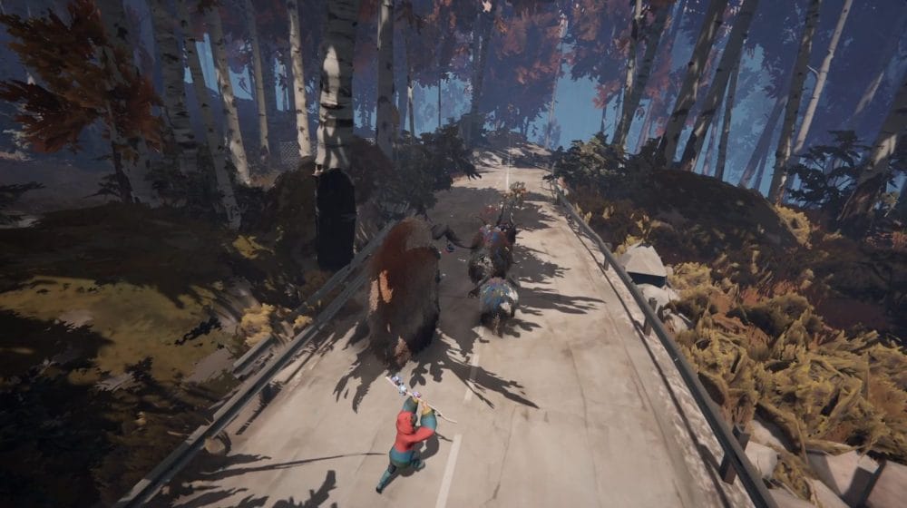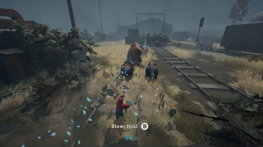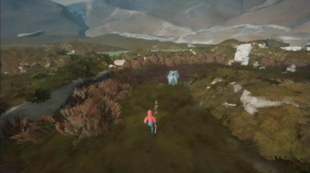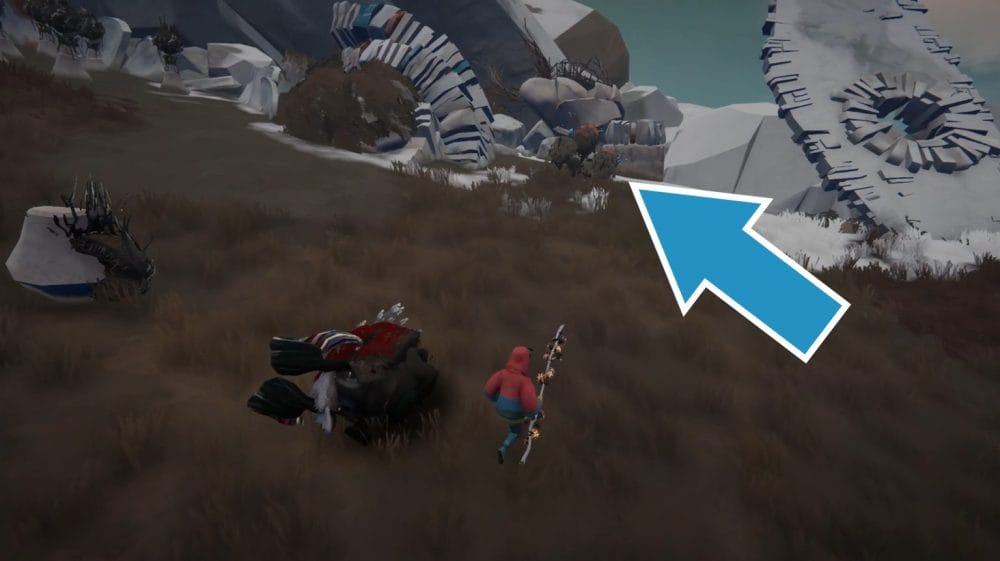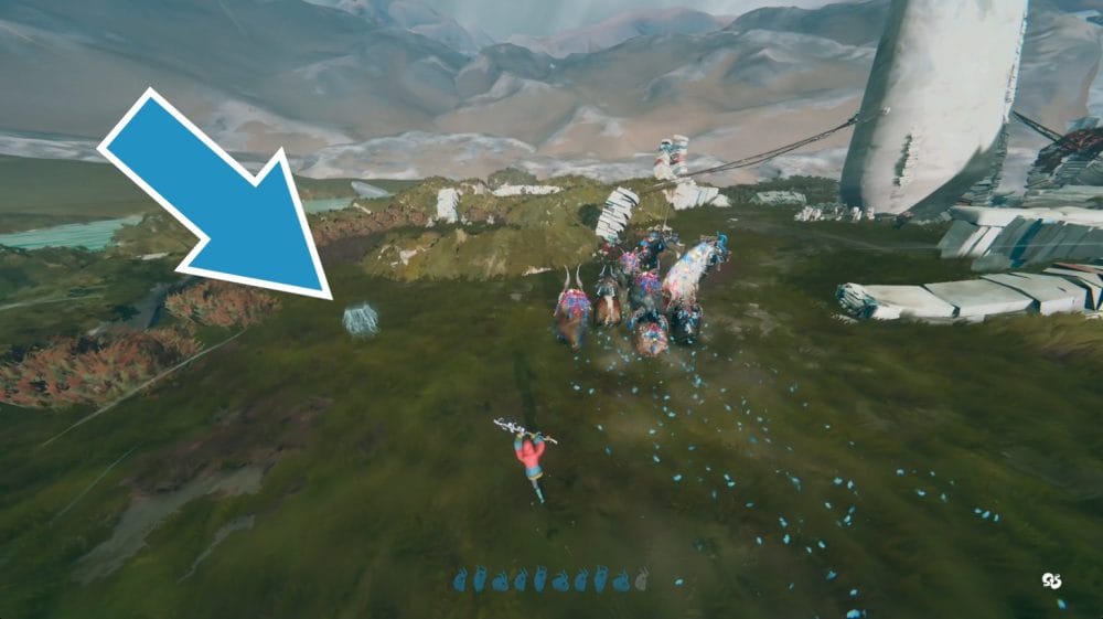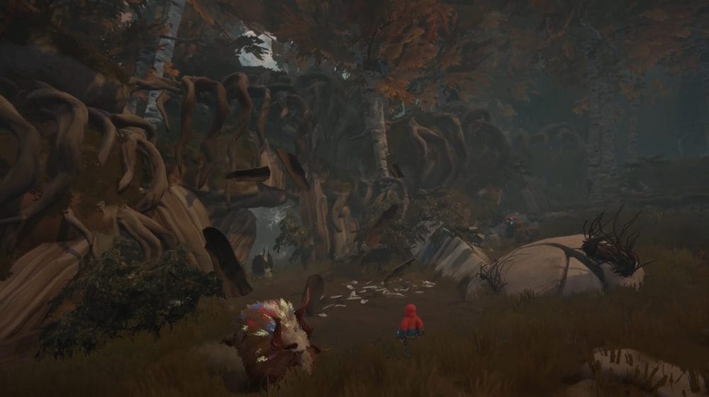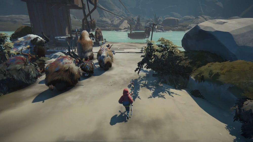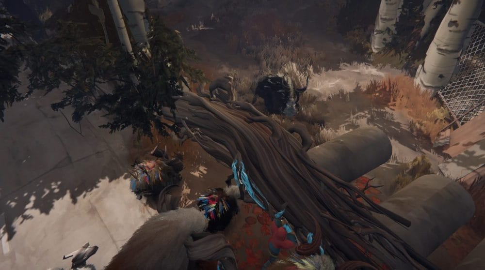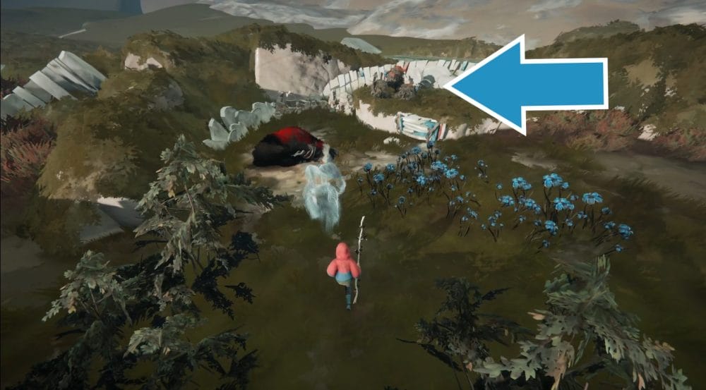 Later on, you will be guiding your herdling up the side of a mountain peak, when you will spot some of the stick totems that alert the giant birds from Chapter 3, the Autumn Forest. Soon after, a Calicorn will come running towards you and hit one of the totems.