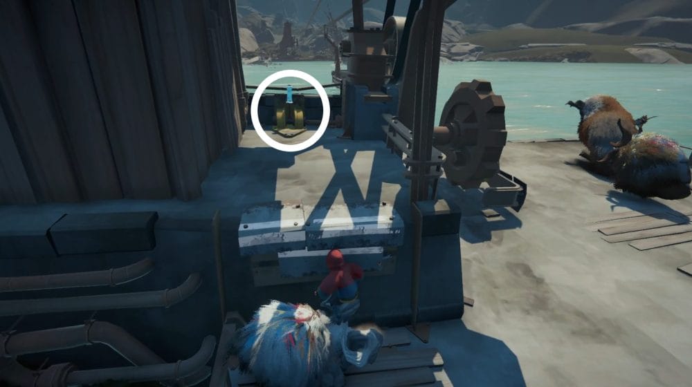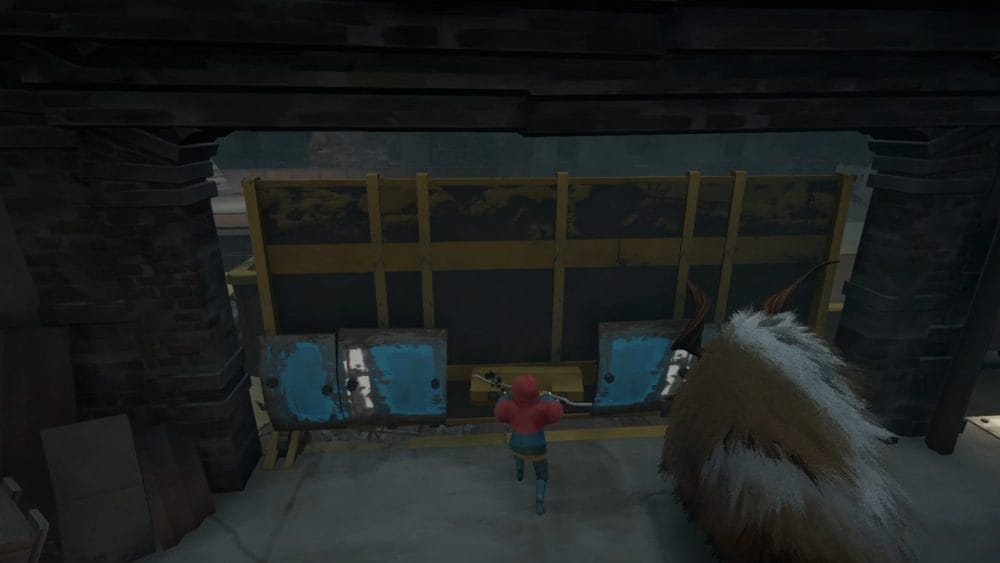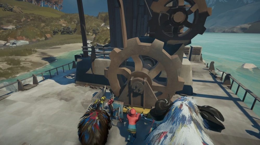 The ferry still isn’t moving. You need to hop back down and push the other gear into place, with help from your herdling, of course.