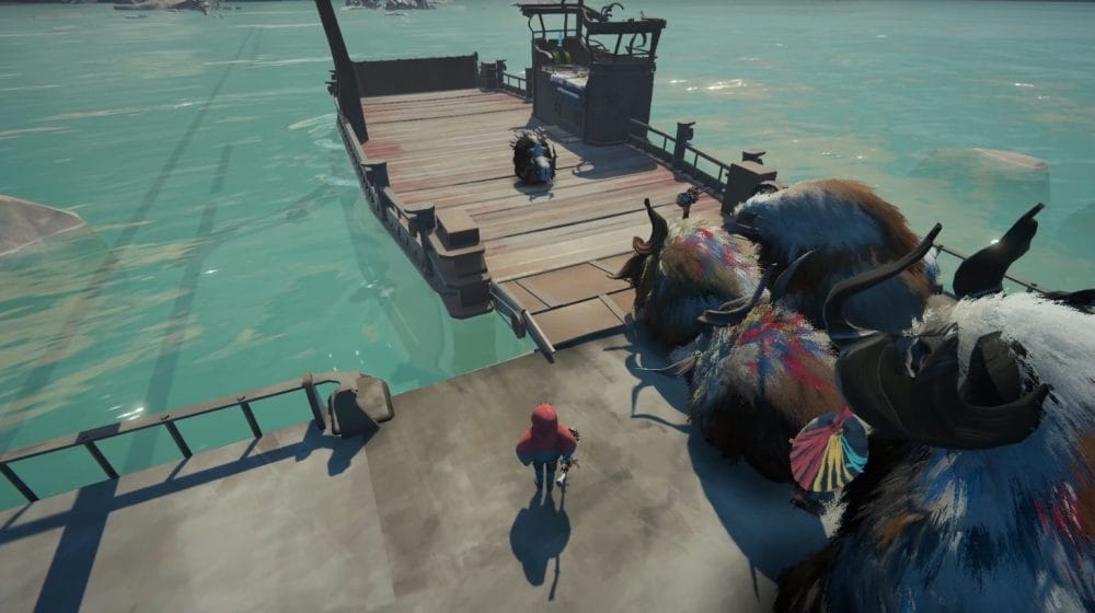 This gets the ferry moving, and it will move to the dock, lowering a bridge so you and your herdling can board. But there just so happens to be a Calicorn waiting on the ferry! (How long have they been stranded there?!)