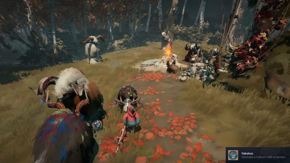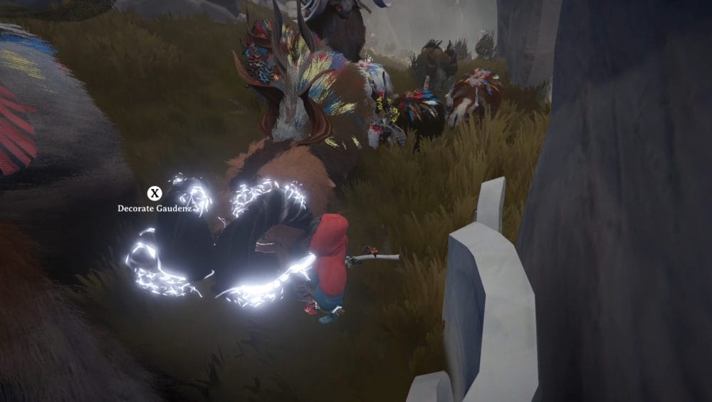 Grab the harness from the statue and drop back down to adorn another of your Calicorn with a harness, unlocking the Highly Decorated achievement.