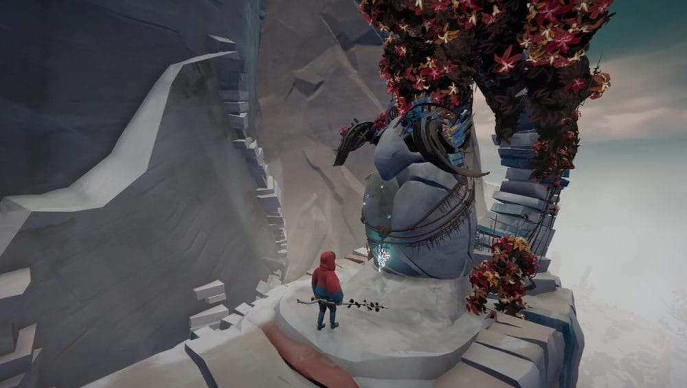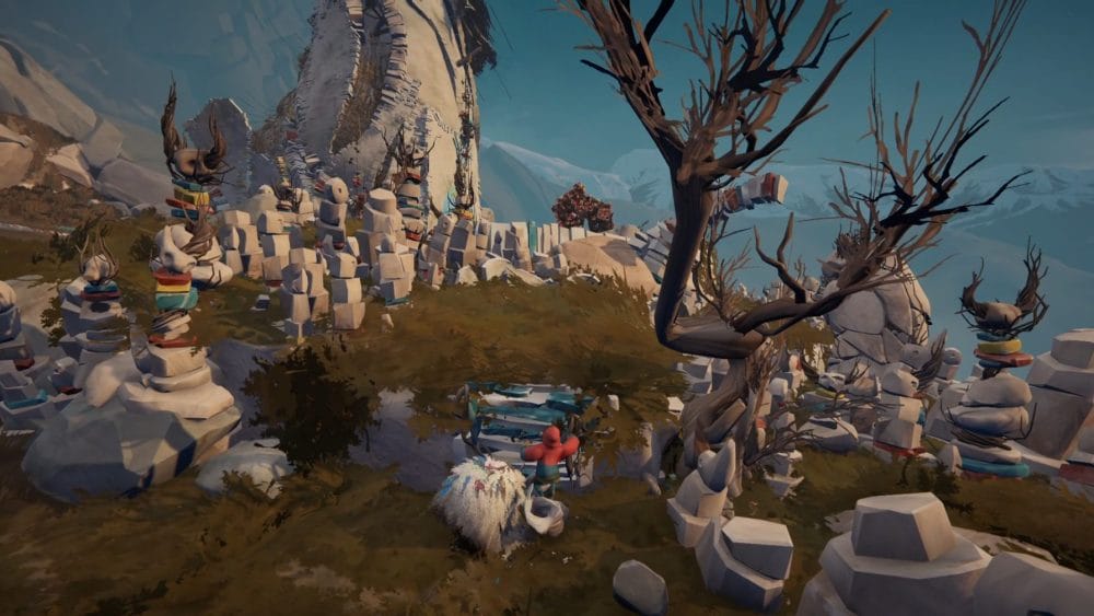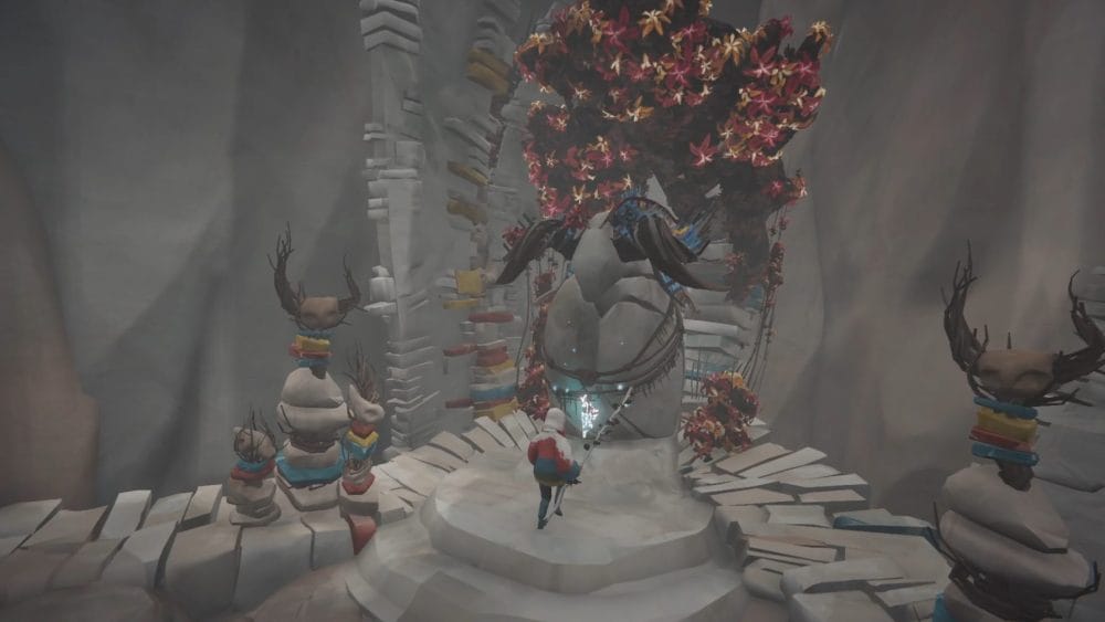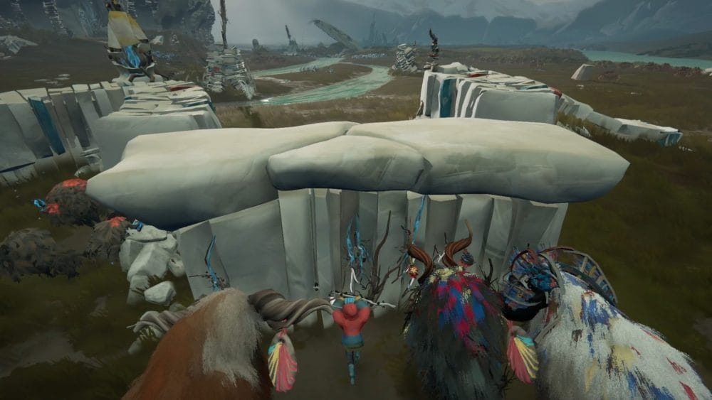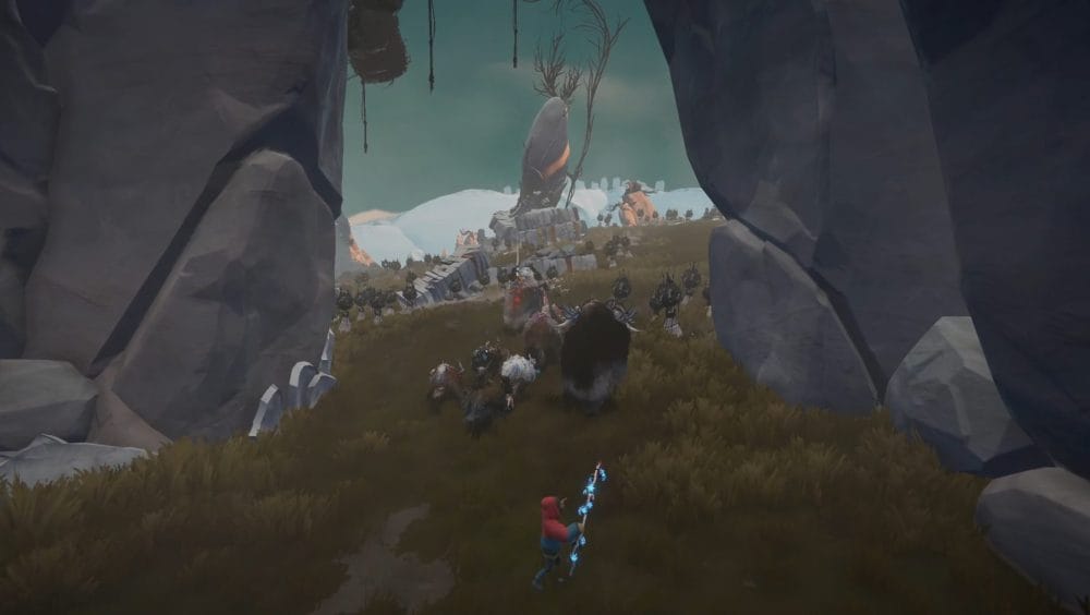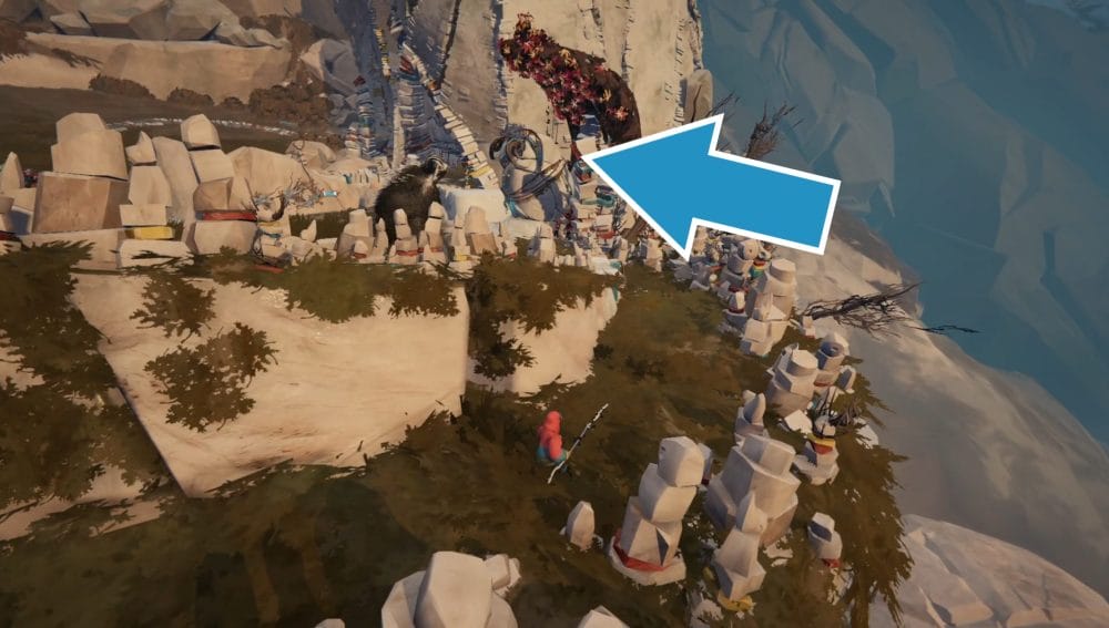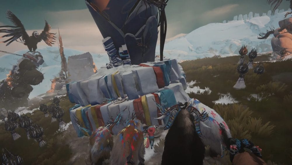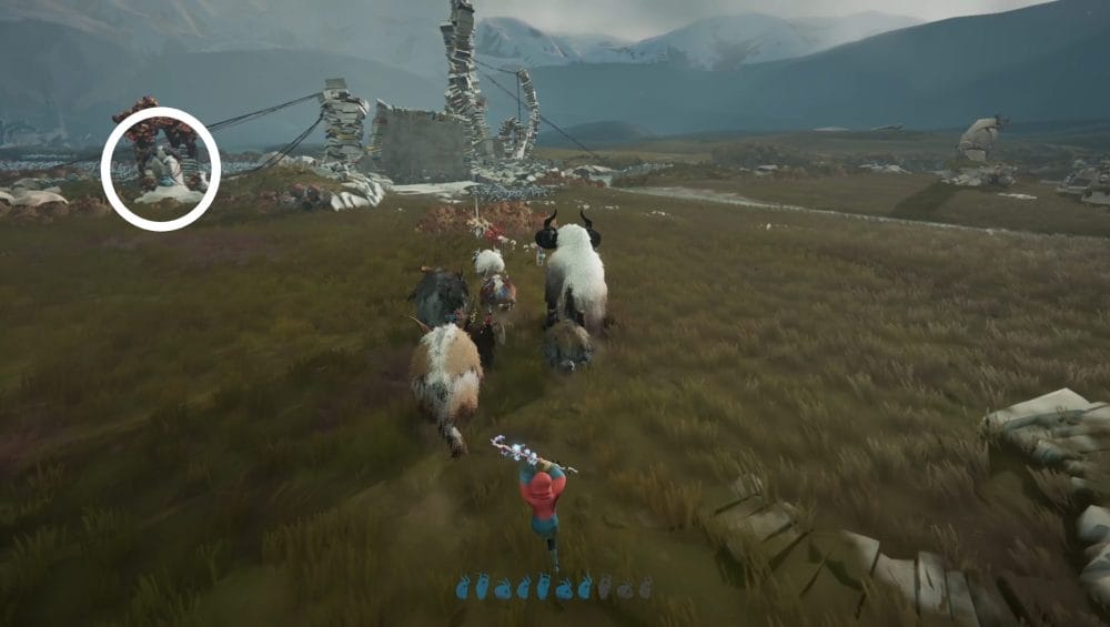Guide your herdling to the right side of the central stone statue, through the stick totems, not alerting any of the ghoulish birds. Have you Calicorns help you move the statue to knock over all the totems and scare away all the avains.