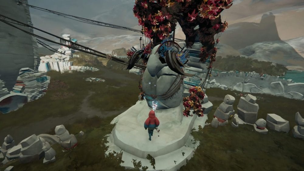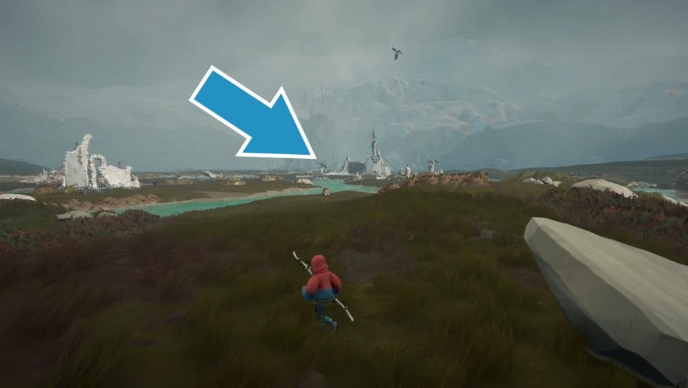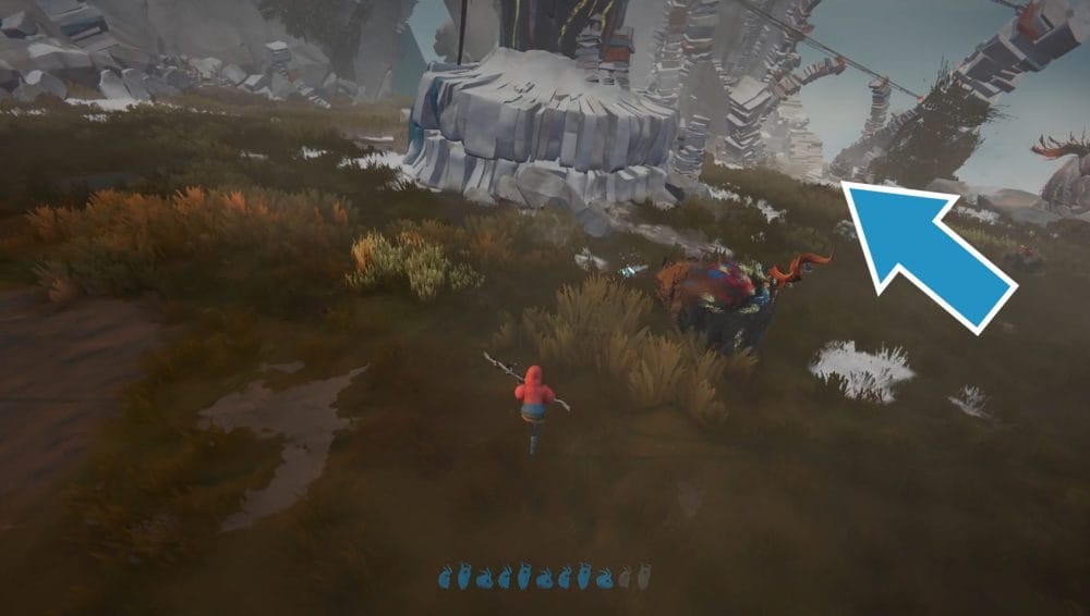 Climb up onto the stones and interact with the statue to collect the harness.