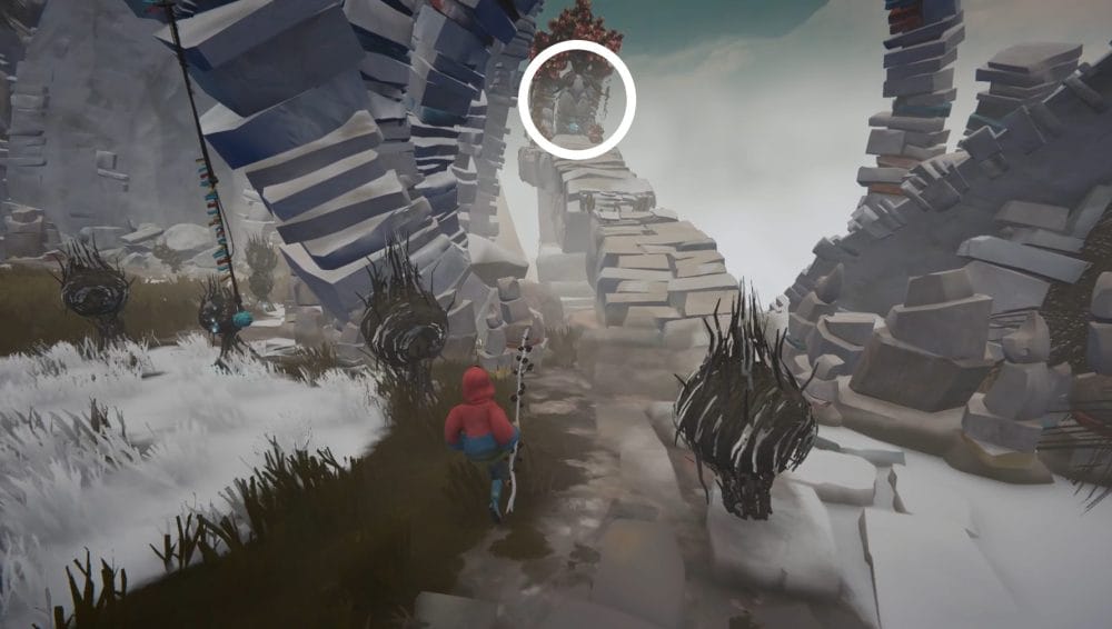 The third harness is also found during Chapter 5, the Mountain Range. You’ll reach another stealth section after passing through an arch with one of the giant birds perched atop it.