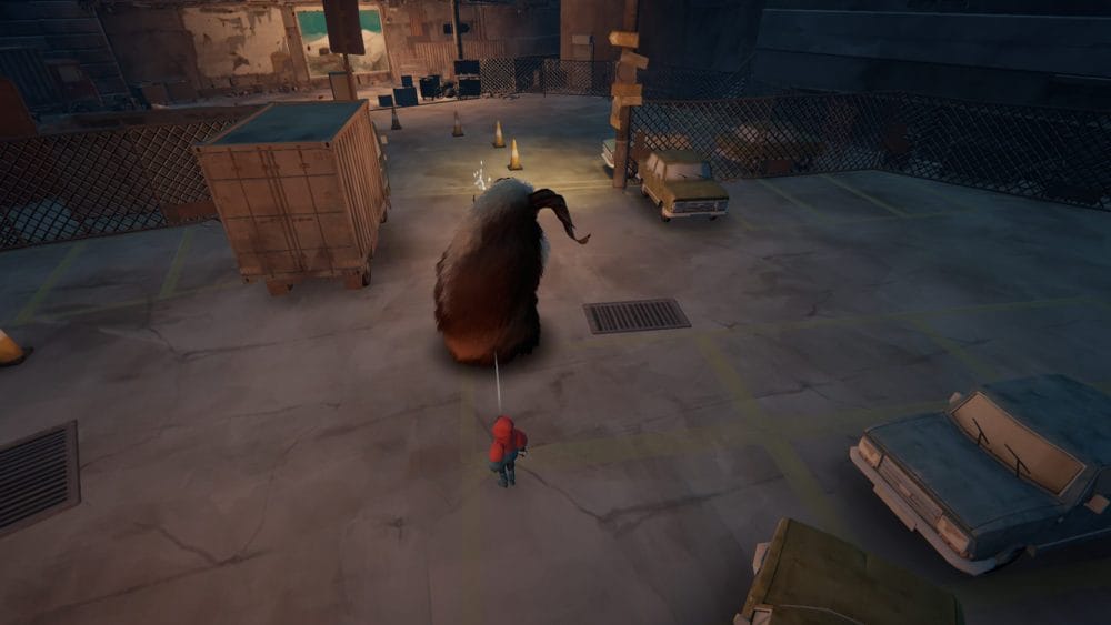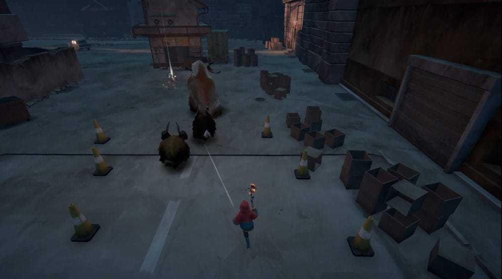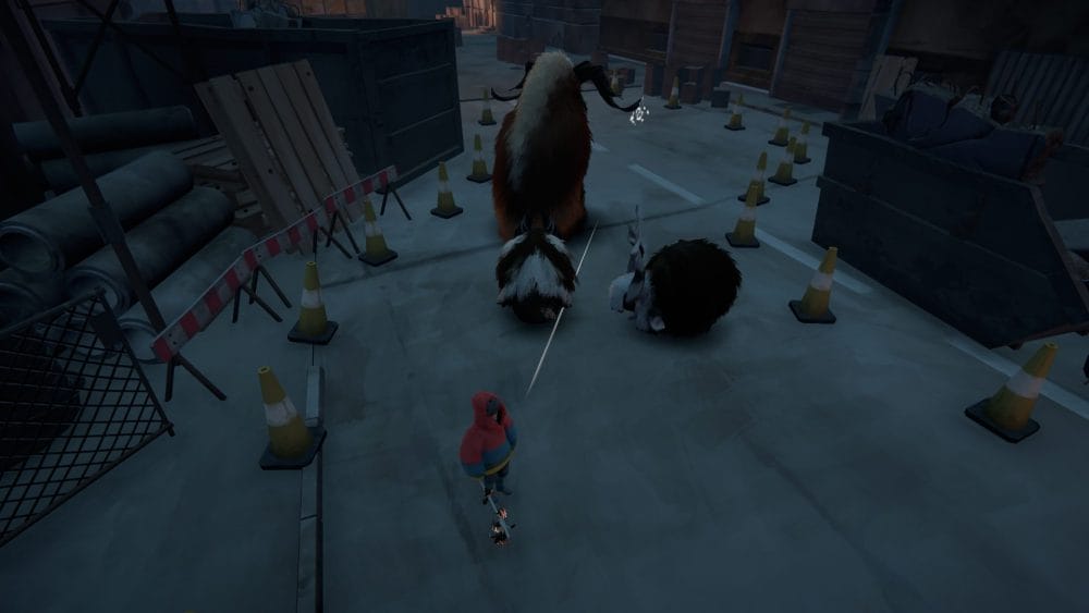 You will guide your single Calicorn through some trash bags into a new area, a car park with traffic cones and vehicles dotted throughout.