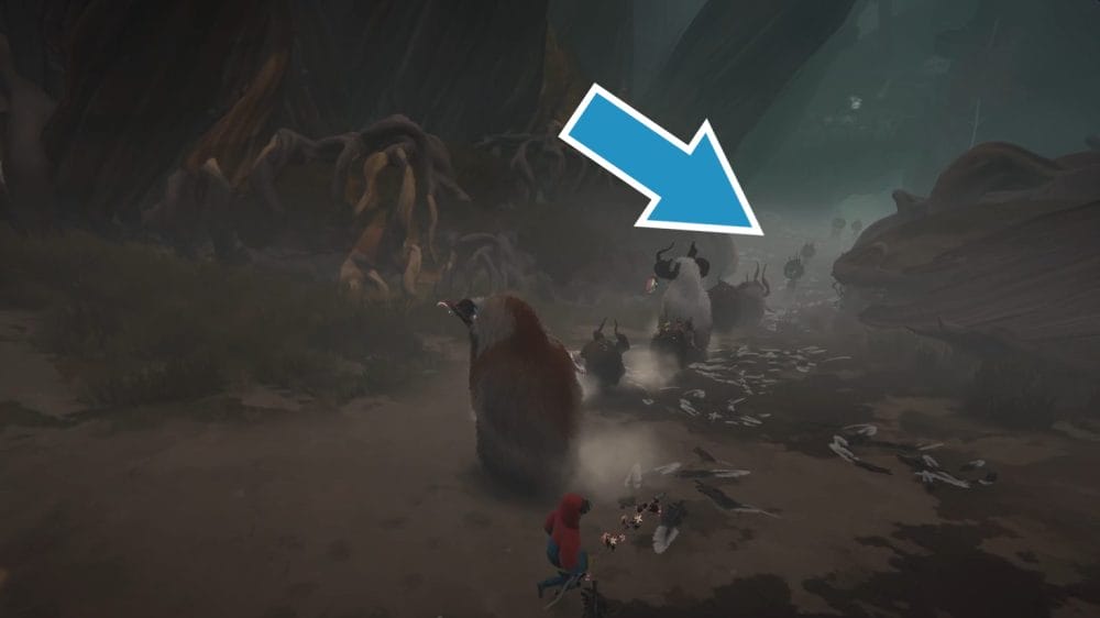 Head through the tunnel under the bird after slowly guiding your herdling around the clumps of totems.