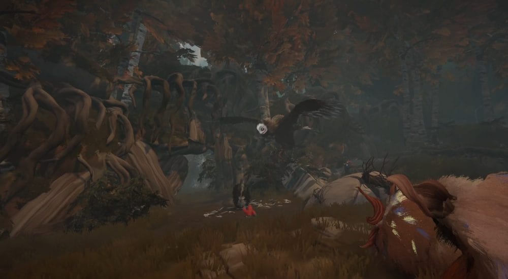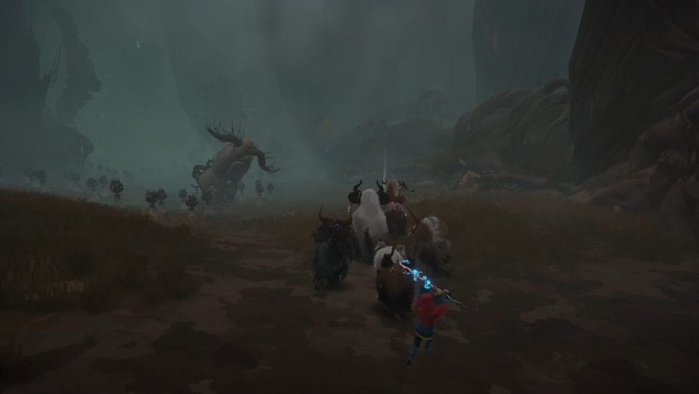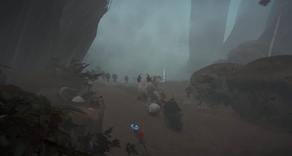 A Calicorn stampedes through a wooden barricade and is attacked by a giant, spooky bird creature. Heal and tame the Calicorn after the cutscene and lead your herdling through the tunnel.