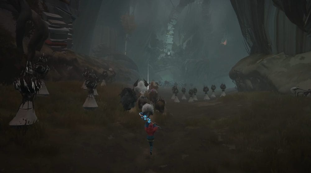 Slowly navigate your way through the last clumps of totems and leave the spooky part of the forest through the tunnel beneath the giant bird.