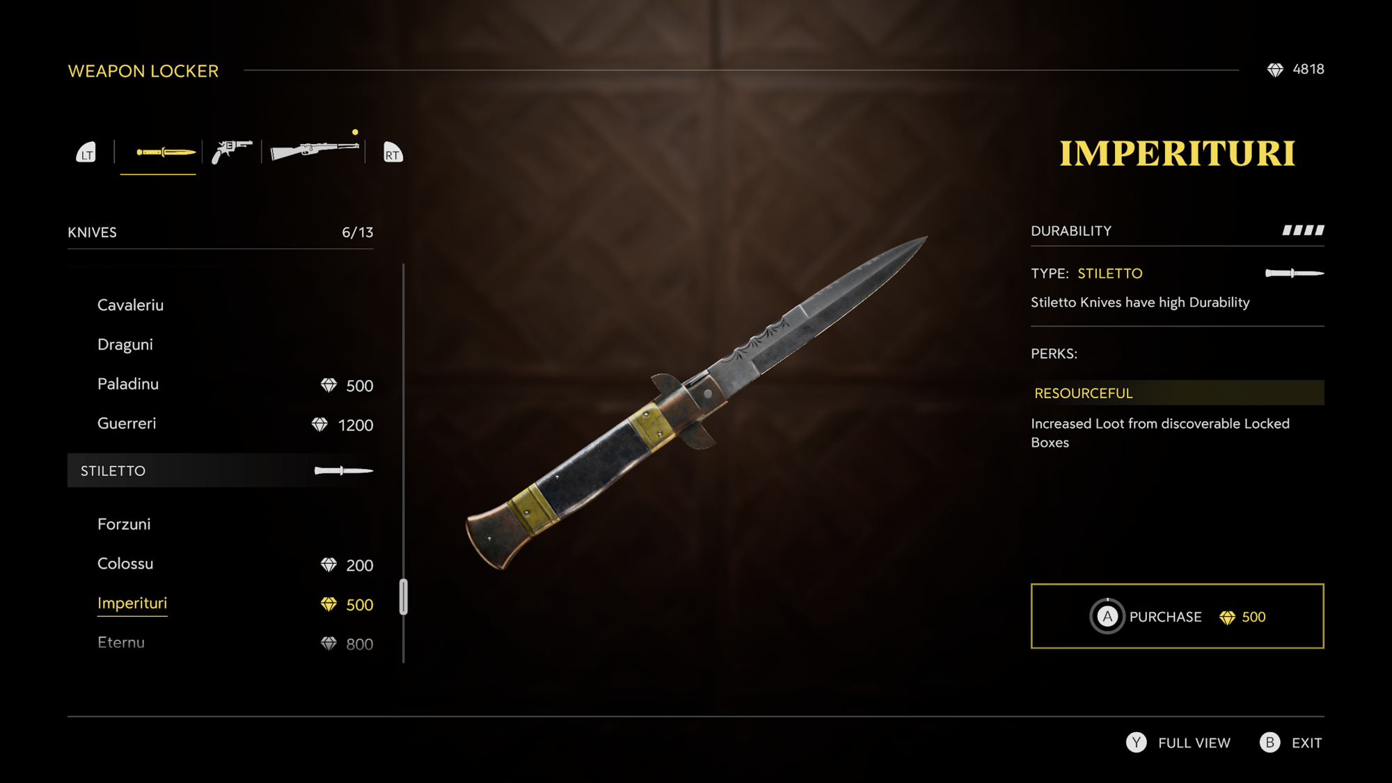 This first step is totally optional but worth it in my opinion. The Imperituri knife in the Stiletto class earns you extra money from opening boxes. While it costs $500 to purchase, it’s definitely worth the investment. If you don’t its fine, but it will slow down this method a little bit. If you want to buy it just head to explore mode and head to your stash and buy it.