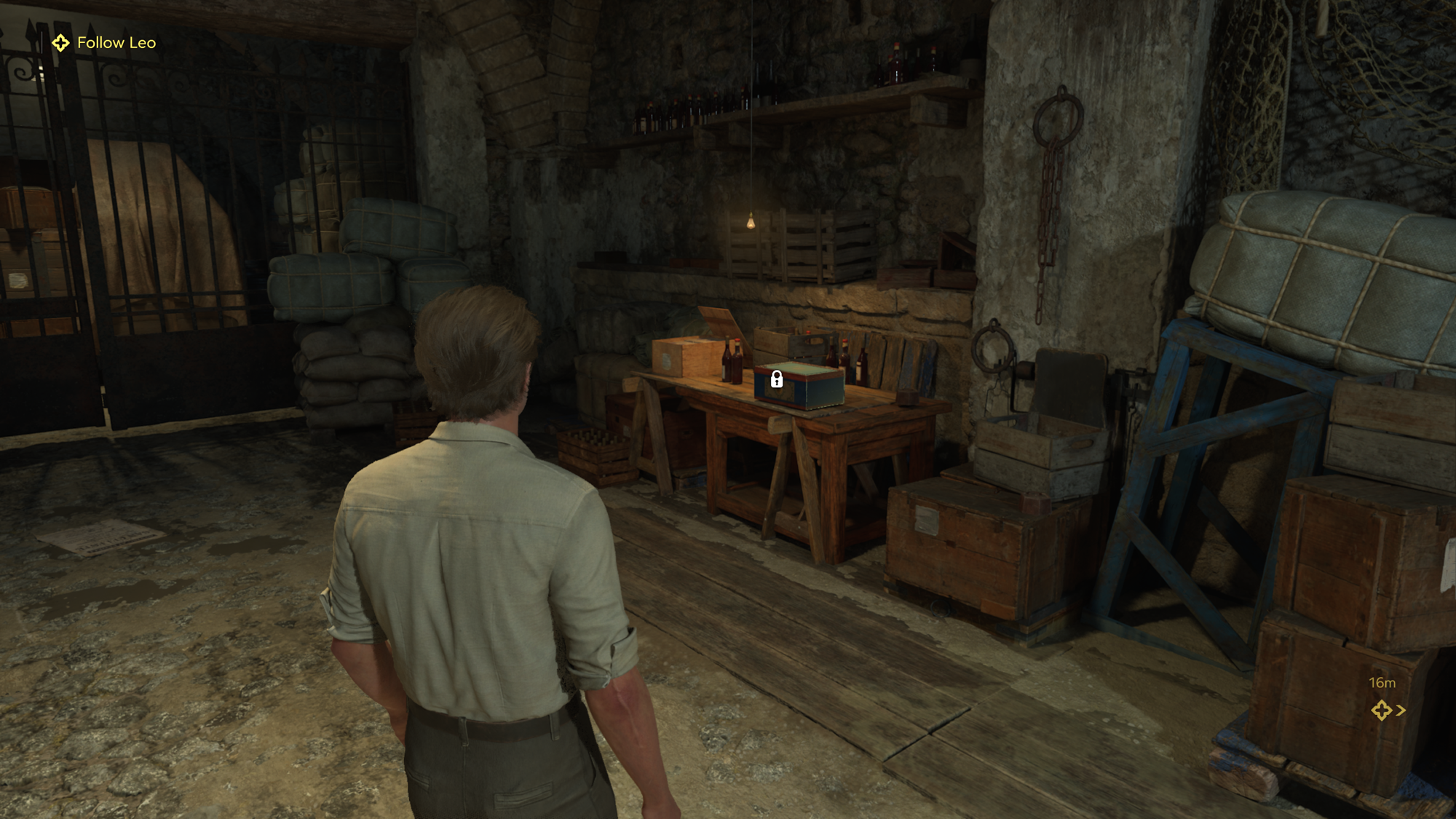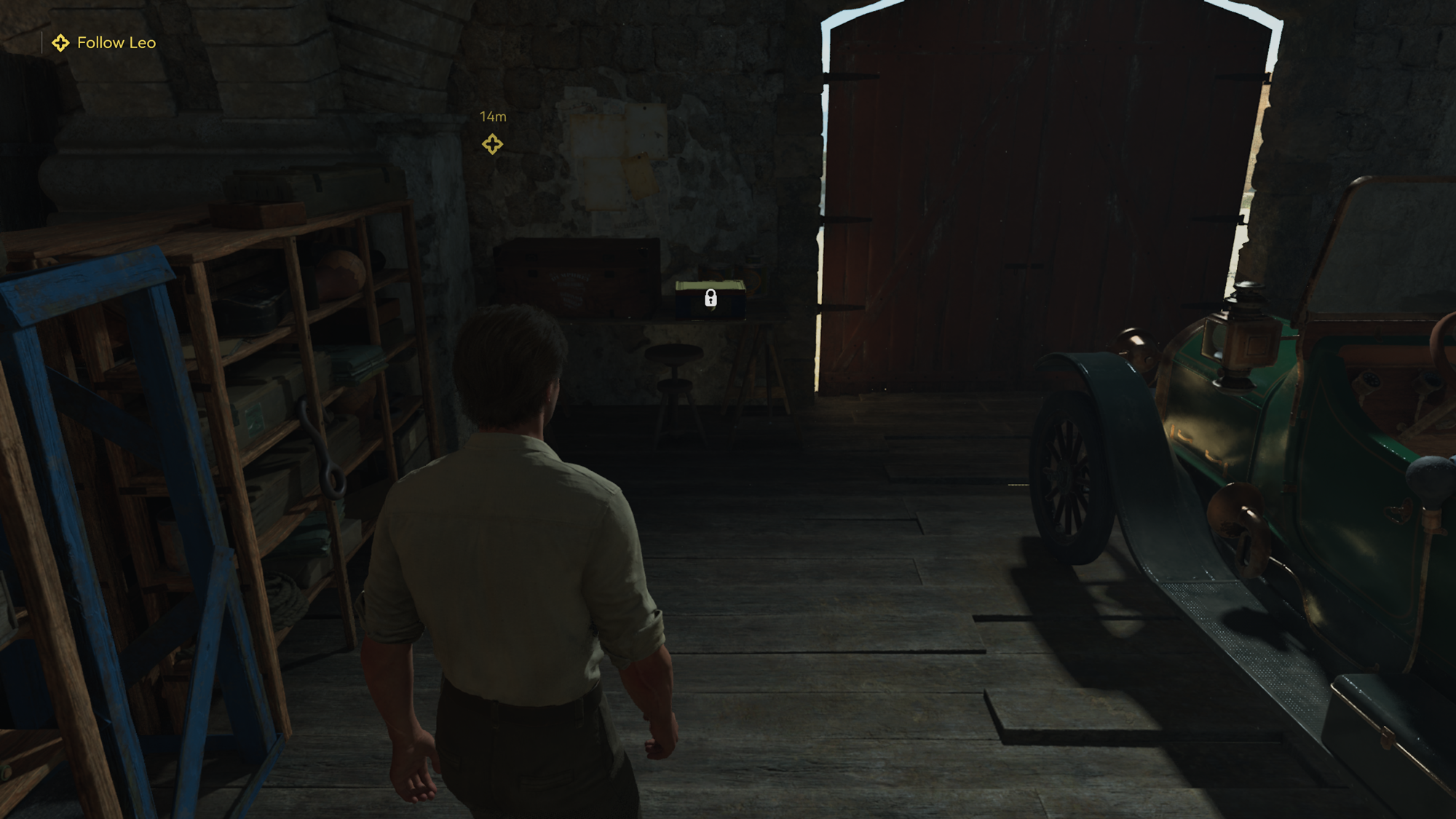 You will now be in a garage and Cesare will be asking you to step out front. Ignore him and instead turn around 180 degrees. To your right will be a box on a bench. Go over and break it open with your knife.