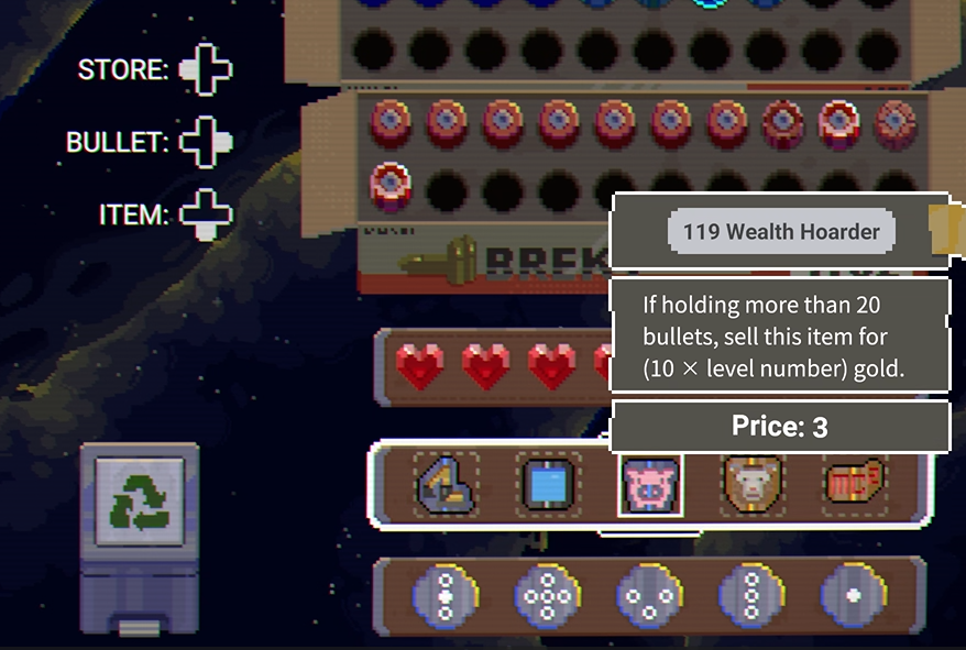 The Wealth Hoarder relic gives you gold when you sell the item. If you’re holding more than 20 bullets in your inventory, you can sell Wealth Hoarder relic to earn 10 times the gold of the current level number. This means you could potentially earn 90 gold before reaching the boss. There is an endless mode, that keeps on going after you’ve defeated the boss at Level 10.