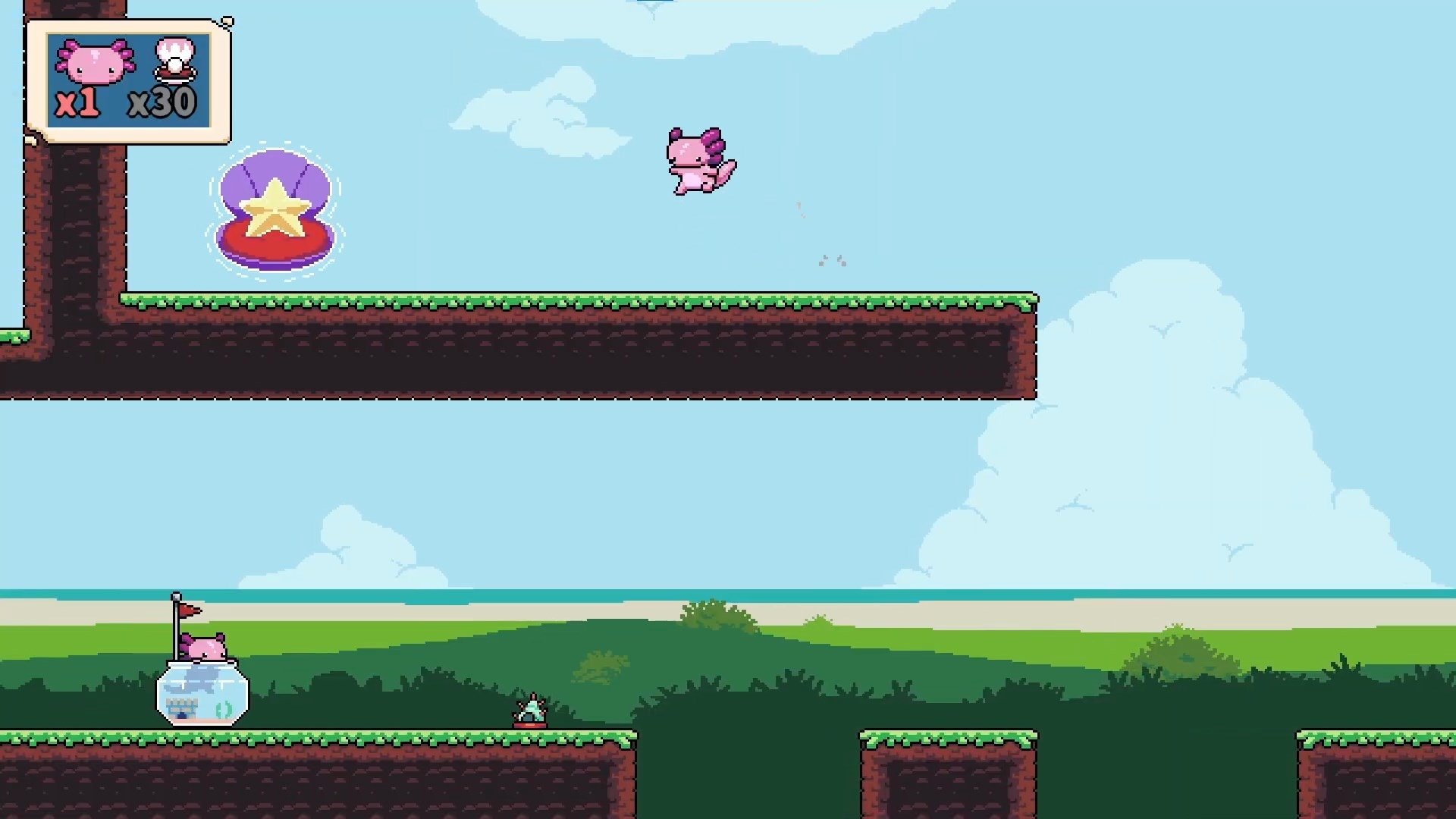 In Axobubble, you control a friendly axolotl in a world of platforms and creativity. Your main ability is to create floating bubbles that act as temporary platforms. Use these bubbles to jump higher, cross dangerous distances, and collect shells while advancing to the big star shell at the end of each level.