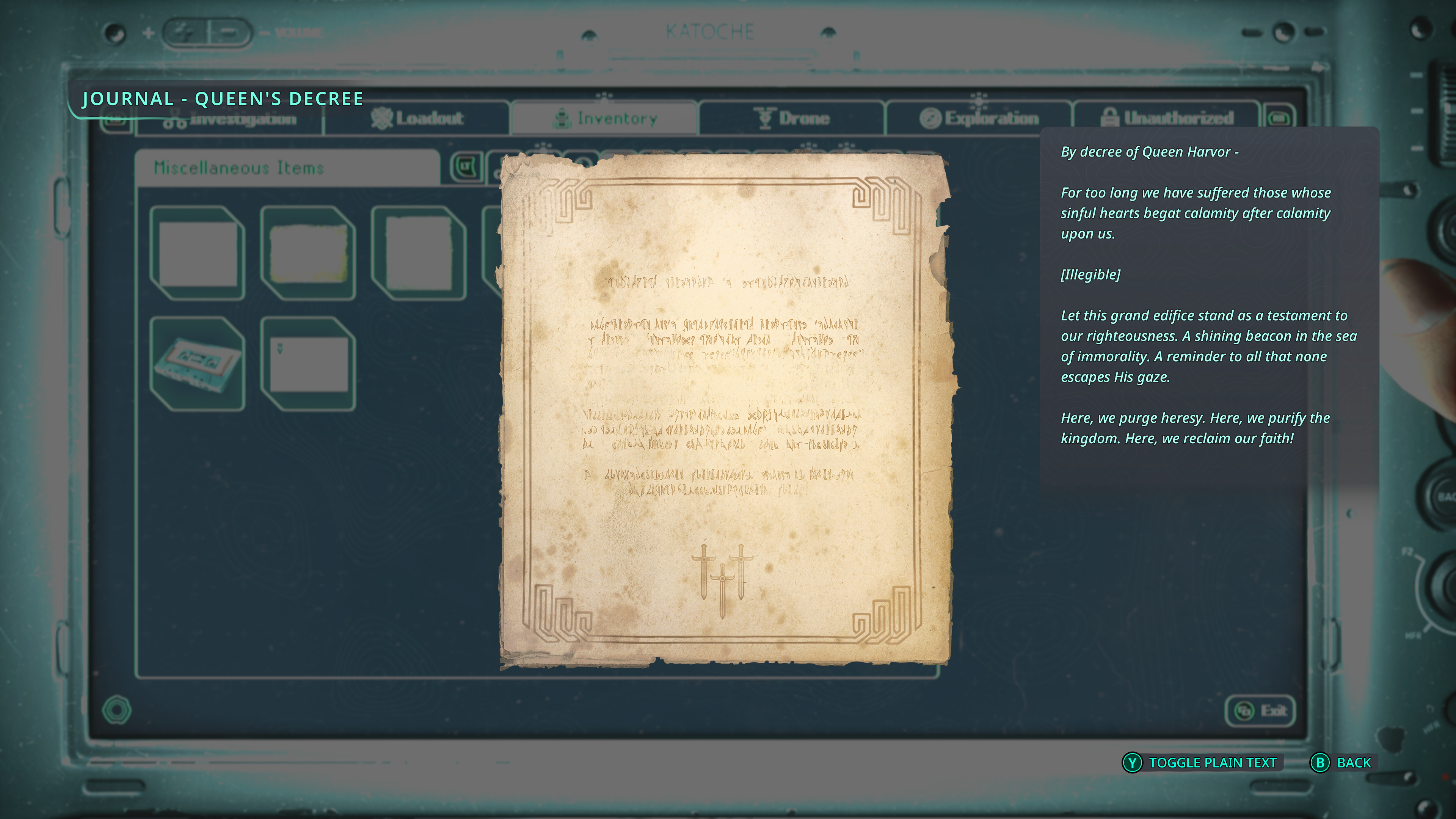 Keep an eye on what you’re collecting. It’s often the case that a document or item you collect may contain a clue to solving a puzzle. Take a bit of time to see where things are kept so you can refer to them easily. You will spend some time in your inventory reviewing documents.