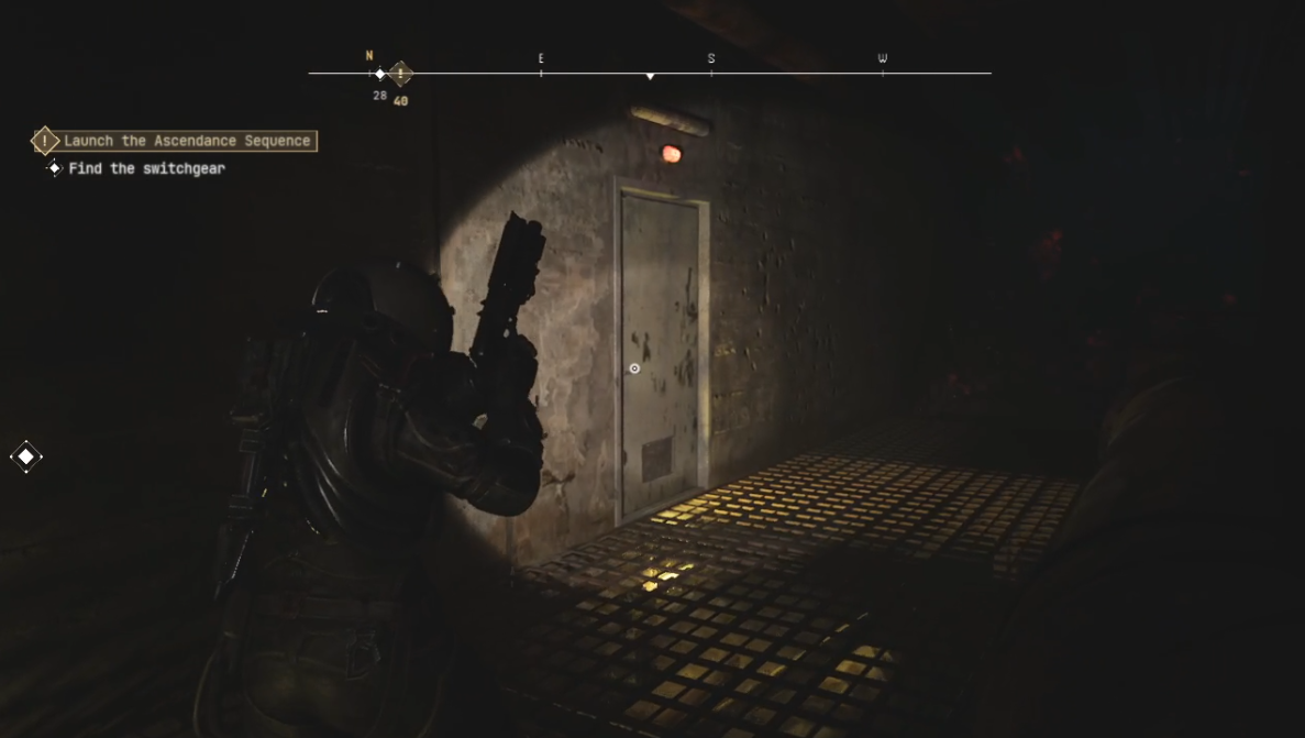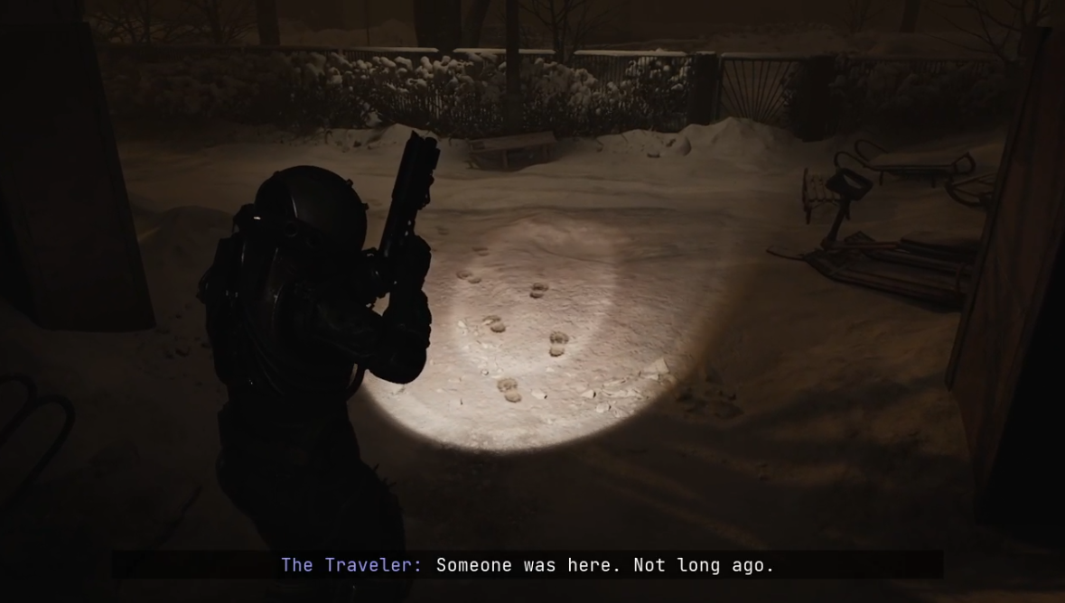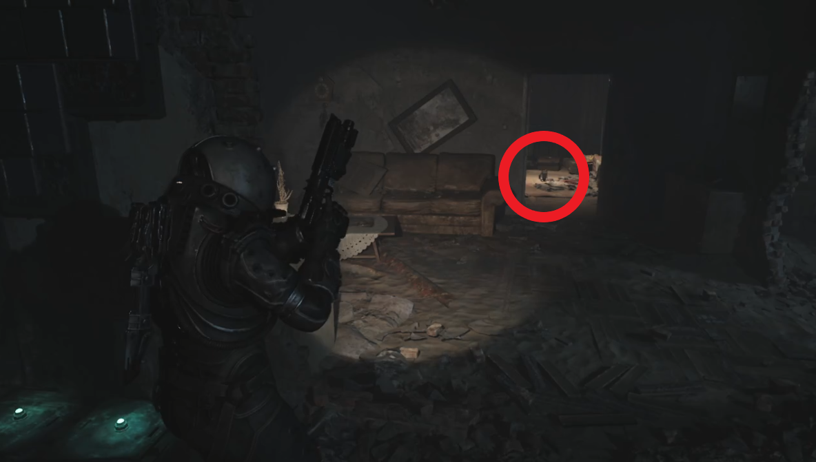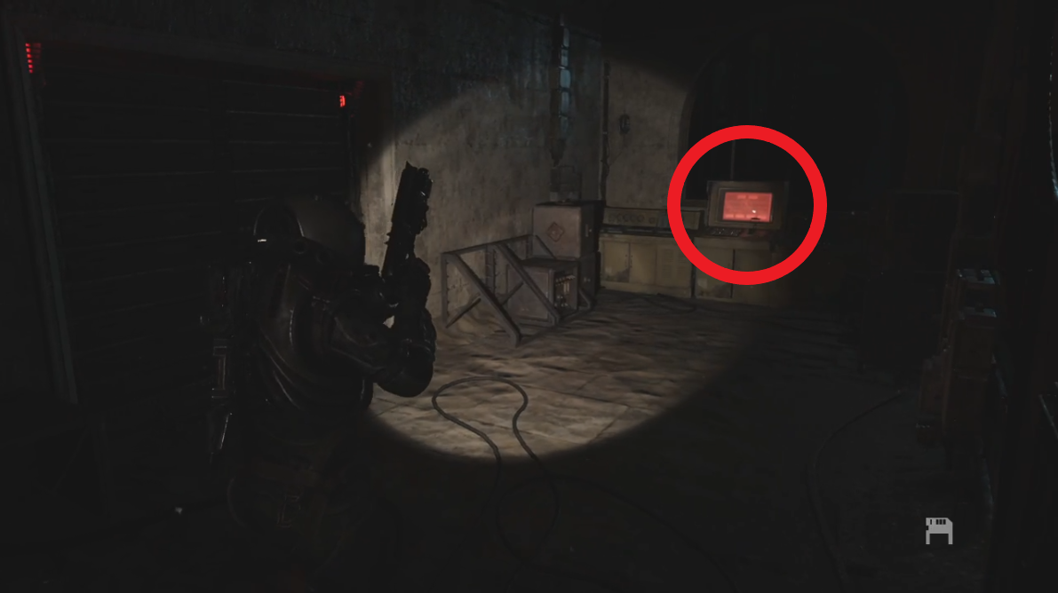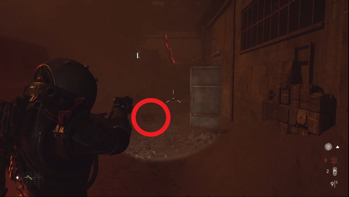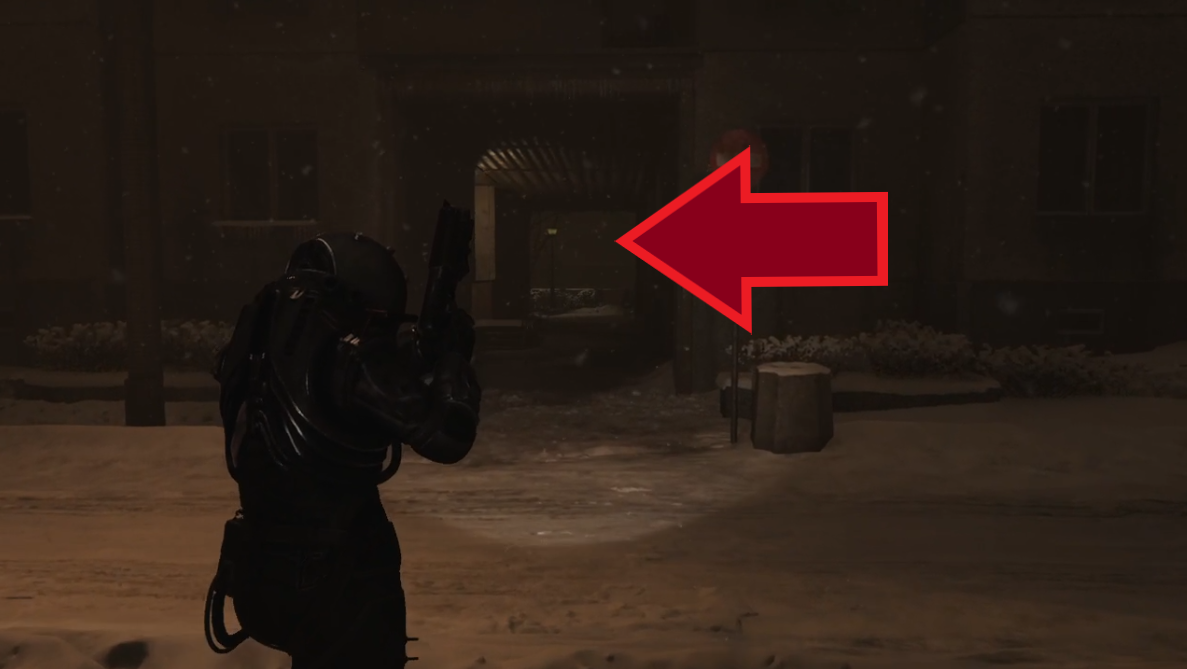 Head down this road until you see a turn going left through another building. Go through here (you’ll know it’s the right way if you spot footprints and ND-3576 makes a comment).