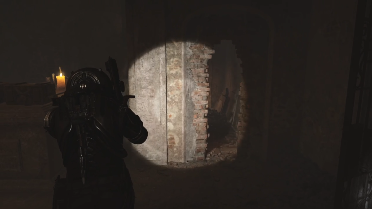 Head to the last set of shelves to find a hole in the wall with a couple of planks across it. Smash them out of the way and slide through the gap.