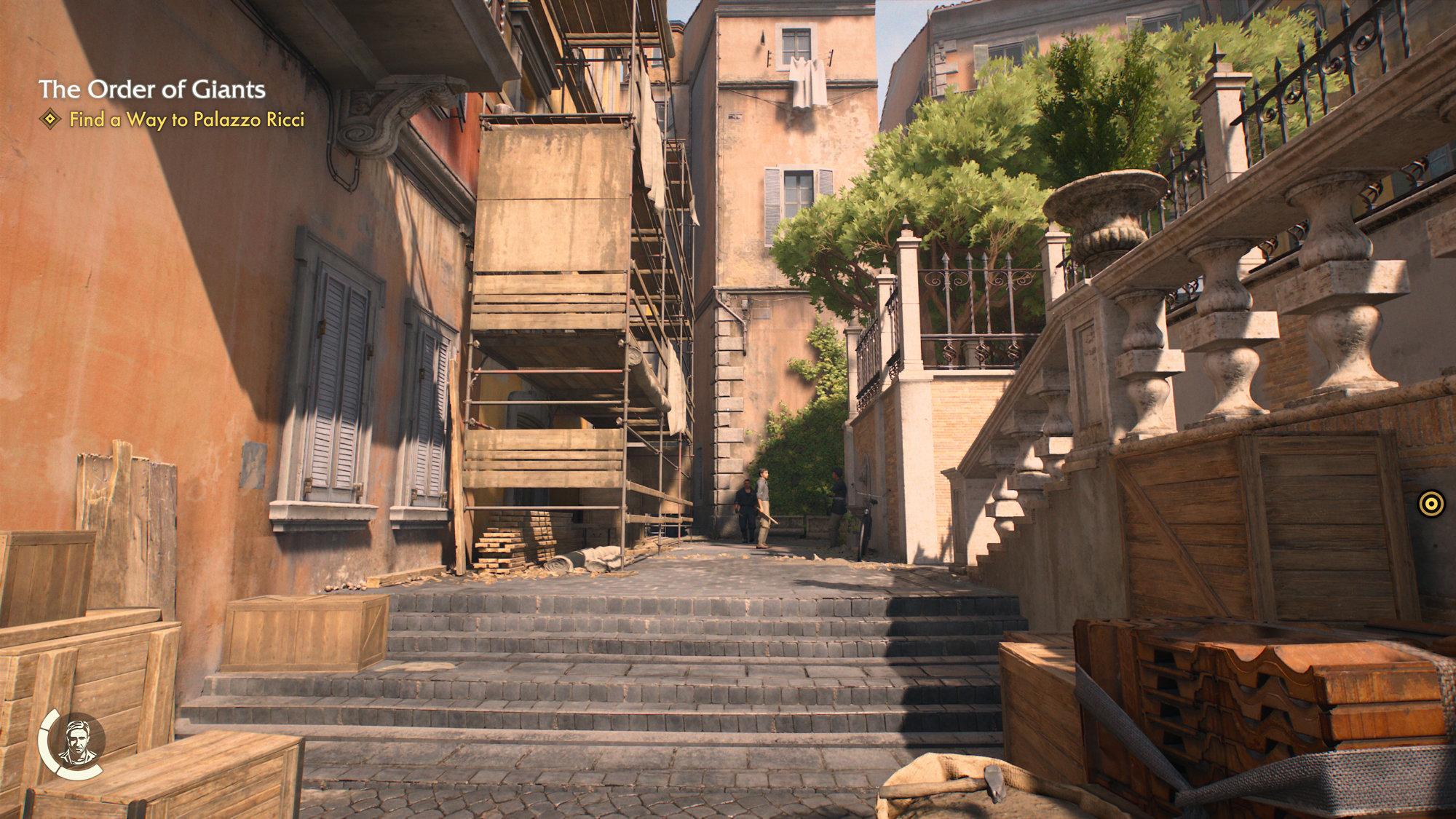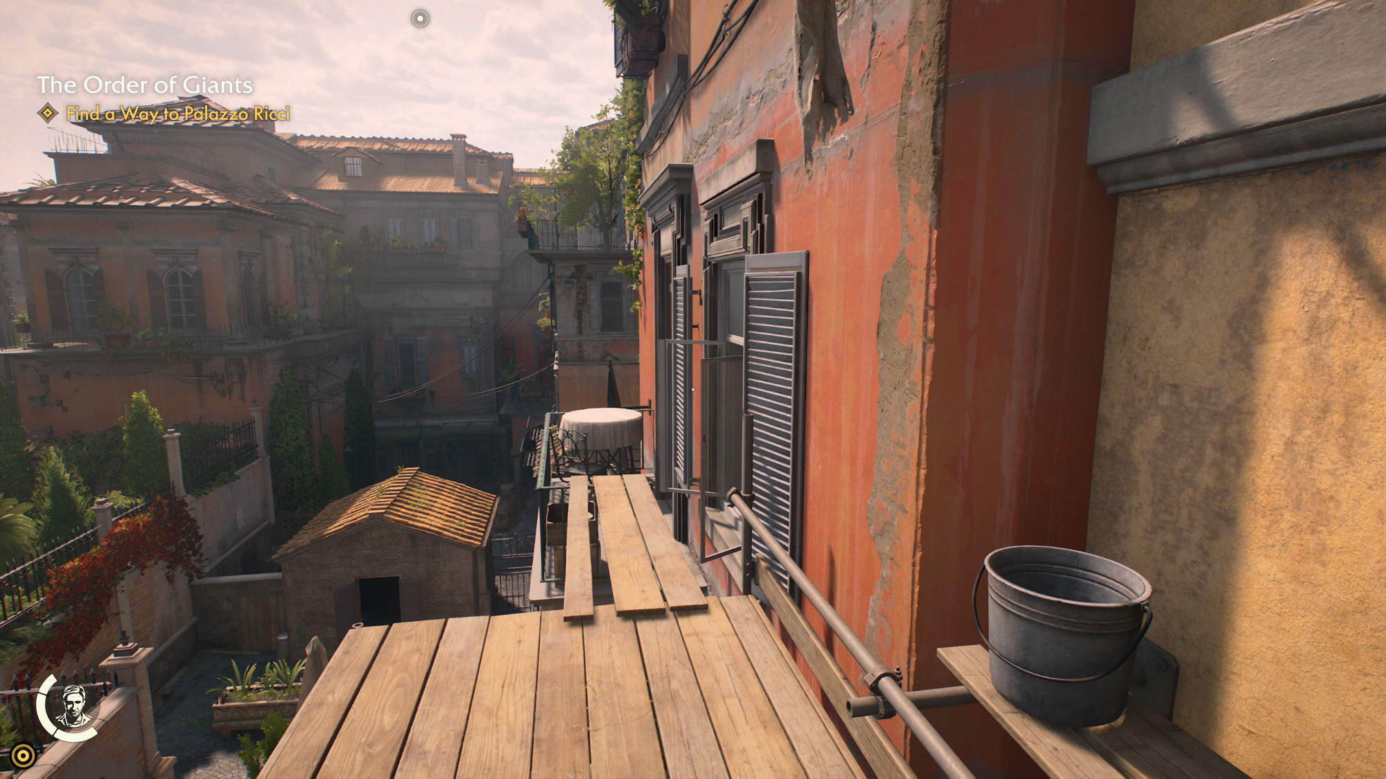 The cat is actually above the Via Giulia so we are going to need to do some climbing. You will see some scaffolding at the side of the building that you need to climb anyway to advance the current mission.
