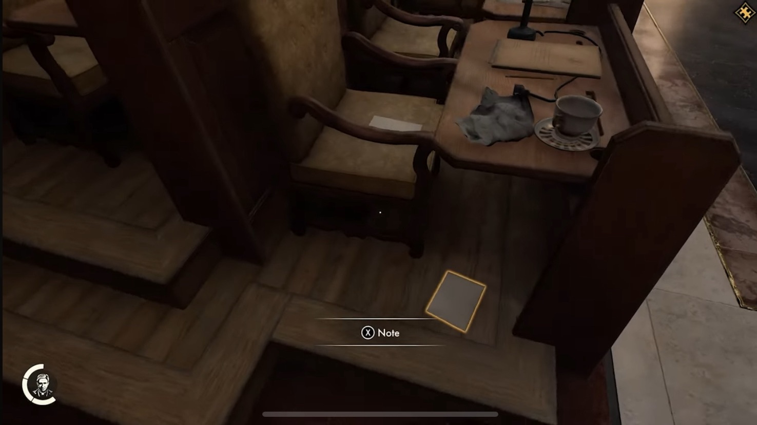 To actually do the steps, start by heading to the row of chairs where you will find a note under one of them. This is Alessandro's Letter and will contain the clues requires to unlock the safe. The clues are: