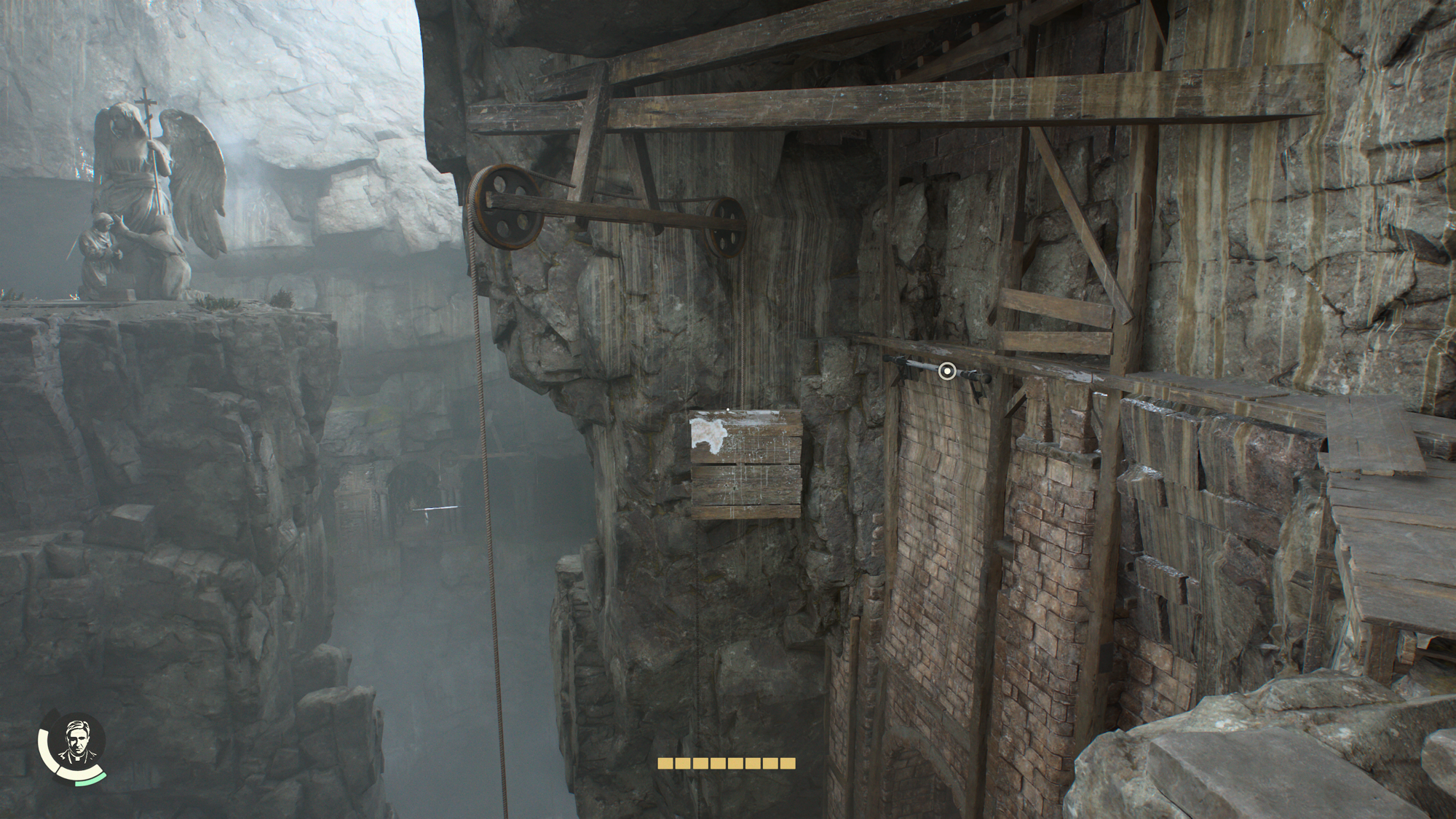 You will come to a spot and see a ledge that you can use your whip to grab ahold of. You will likely need to jump to get the button prompt so do so and then lower yourself as far as you can and drop down.