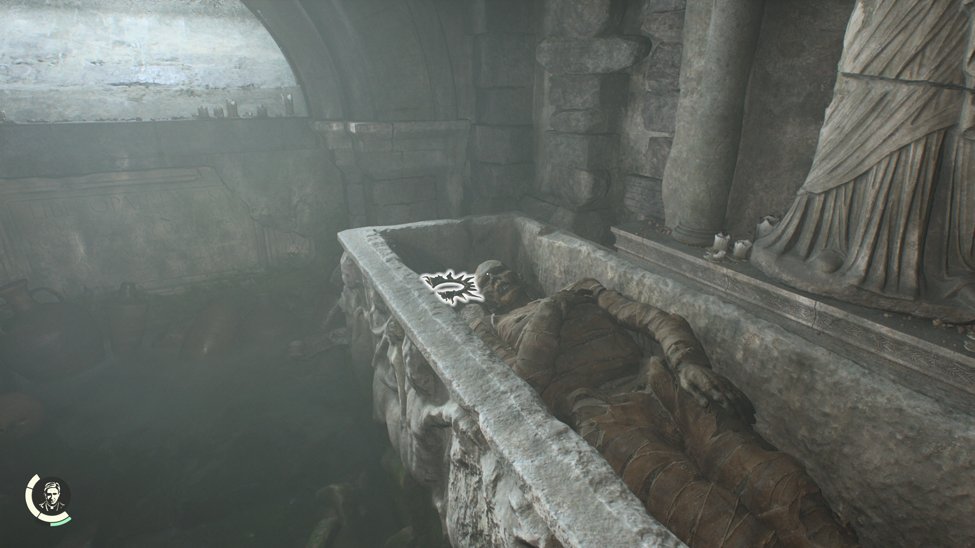 The first artifact is found above the serpent puzzle. Raise the platforms by solving the first 3 steps (if you need help we have our guide here). Now use the platforms to jump above and hop over to the little broken ledge. There will be a long hallway here that goes down. Head to the end and then make a left to find the artifact in an open tomb.