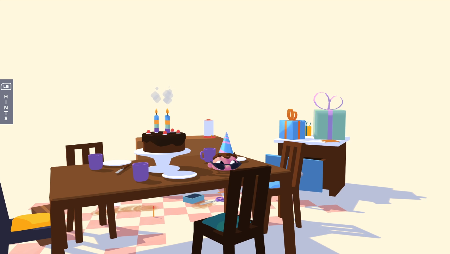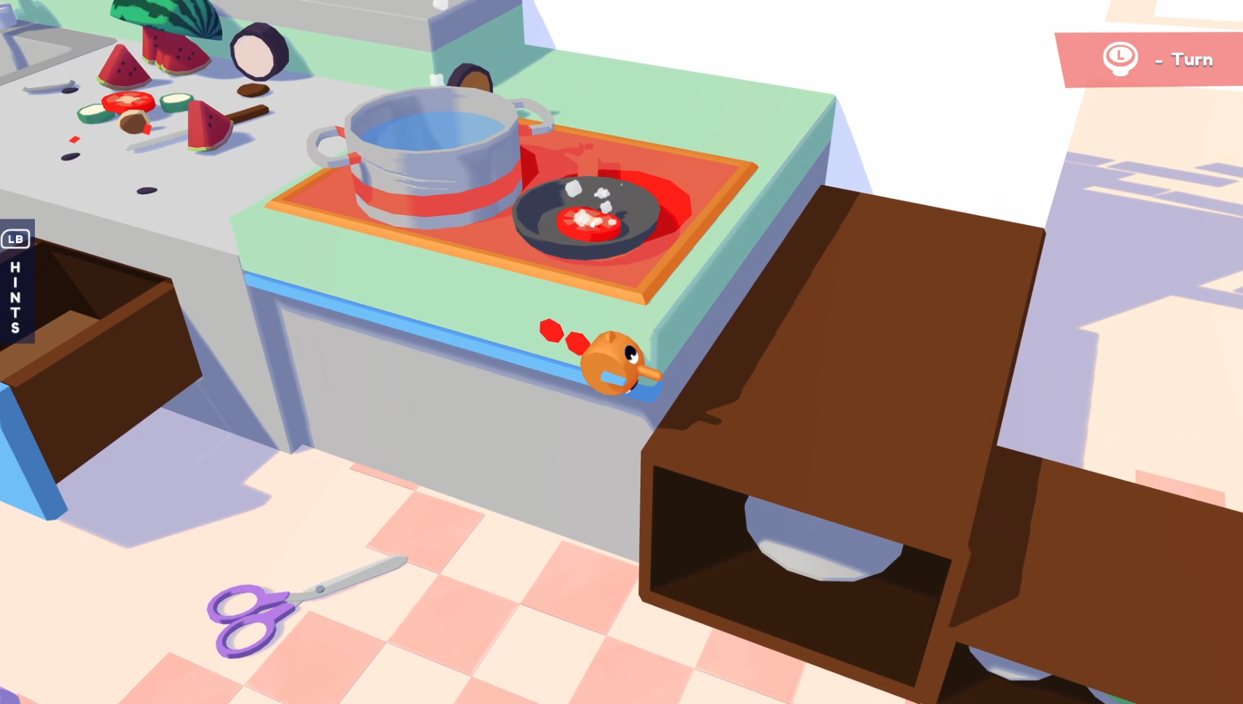 As I said earlier, Henry is only the top half of a head, with a nose, eyes, and ears. He can still move about and jump a short height, but he can’t perform any other actions as himself. The trade-off is the ability to become and move about as hundreds of different objects throughout the game, many of which have their own mechanics. Want to unwrap a birthday present? Possess a pair of scissors to cut the ribbon. Need to answer a Maths question at school? Become a pencil and write down your answer on the question sheet. Getting hungry? Prepare a plate of spaghetti by possessing several food items and kitchen utensils, including tomatoes, mushrooms, uncooked spaghetti, a cutting knife, a cooking pot, and a stove!