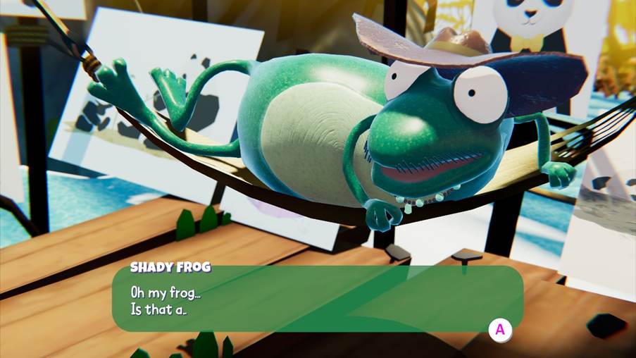 You want to head down the ramp to find Shady Frog, who is obsessed with pandas, and we will now wake up with the chicken.