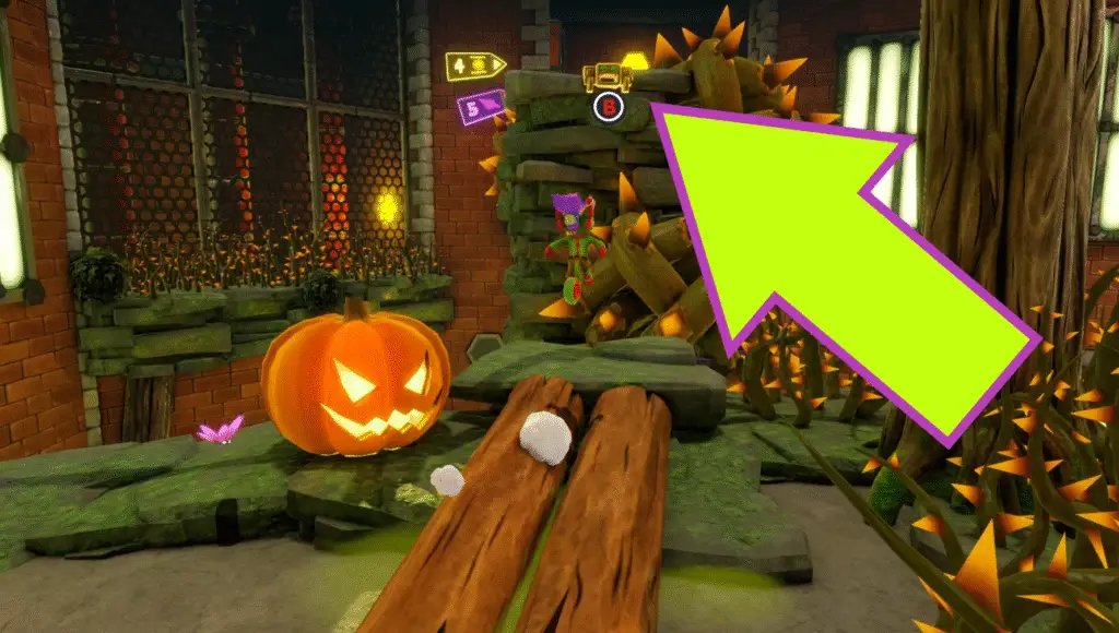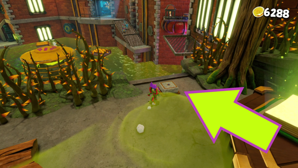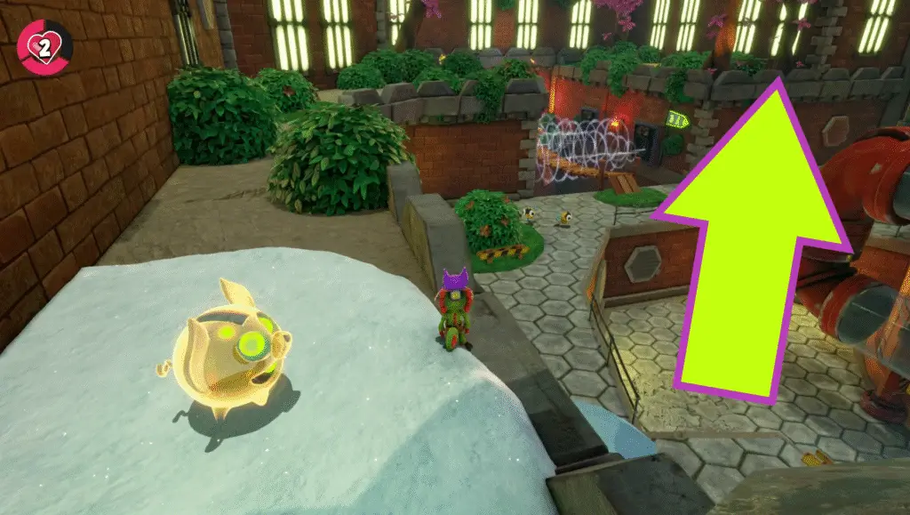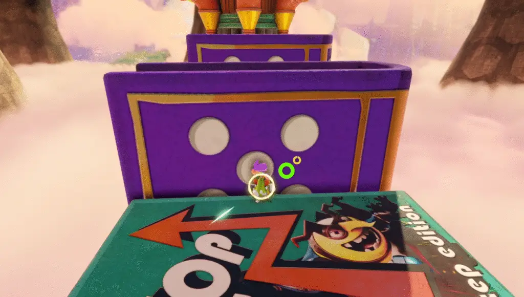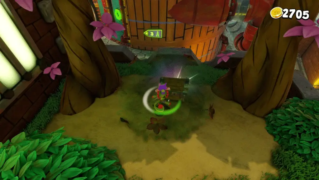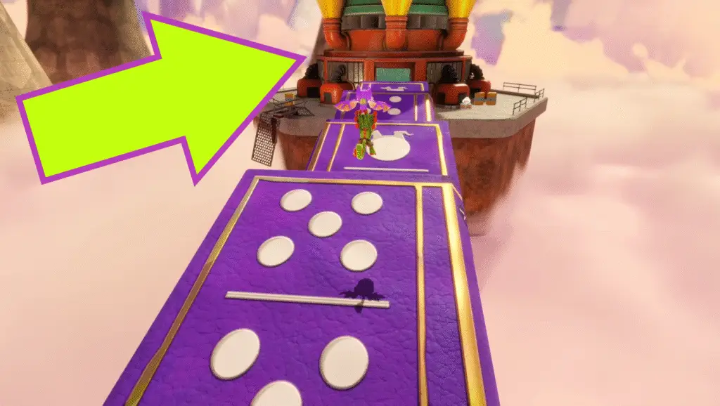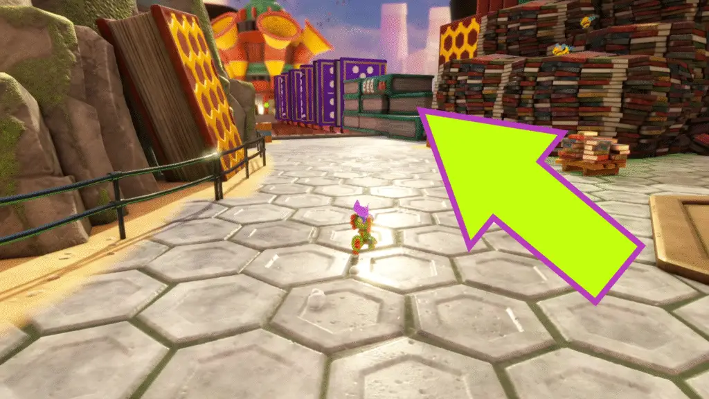 Use Yooka’s charged-up roll to knock the first purple book, causing a domino effect and creating a bridge across to the floating island. Cross the newly constructed bridge and head around to the back.