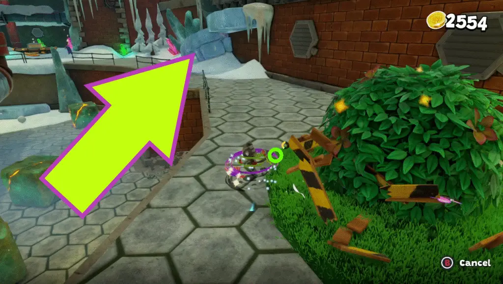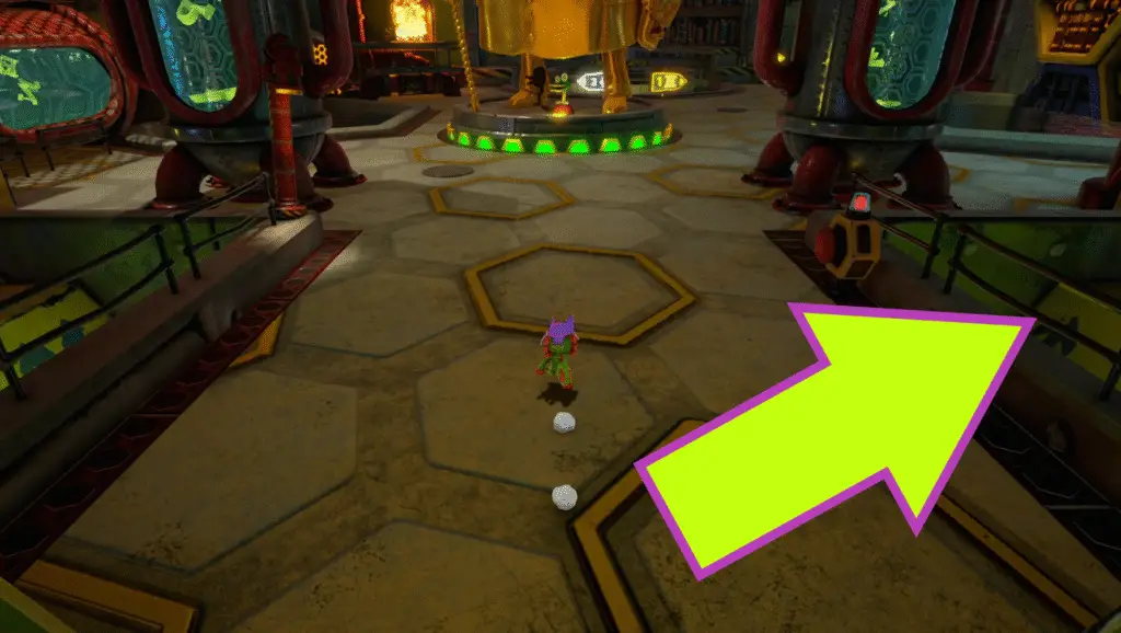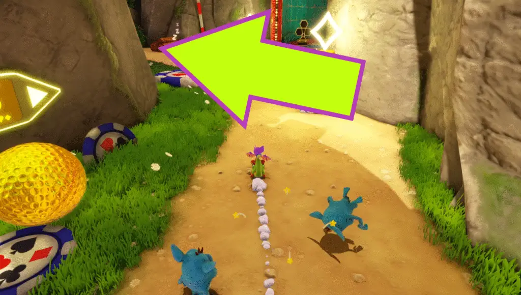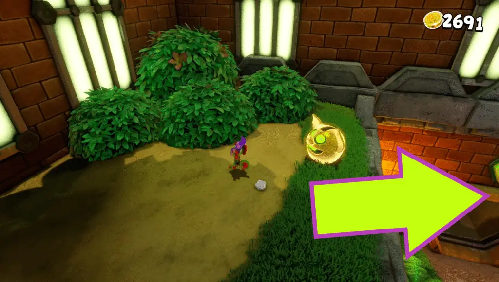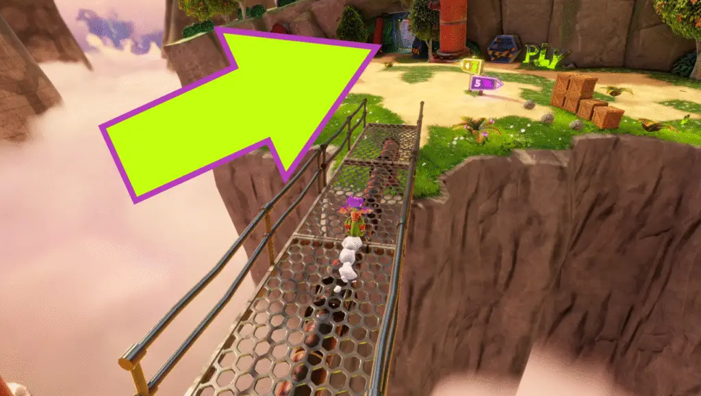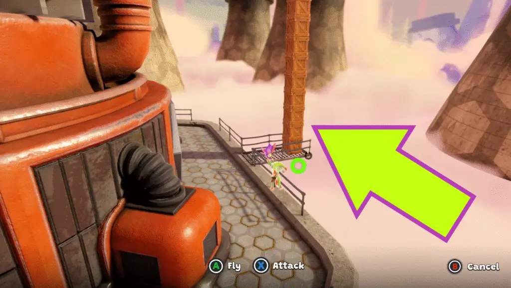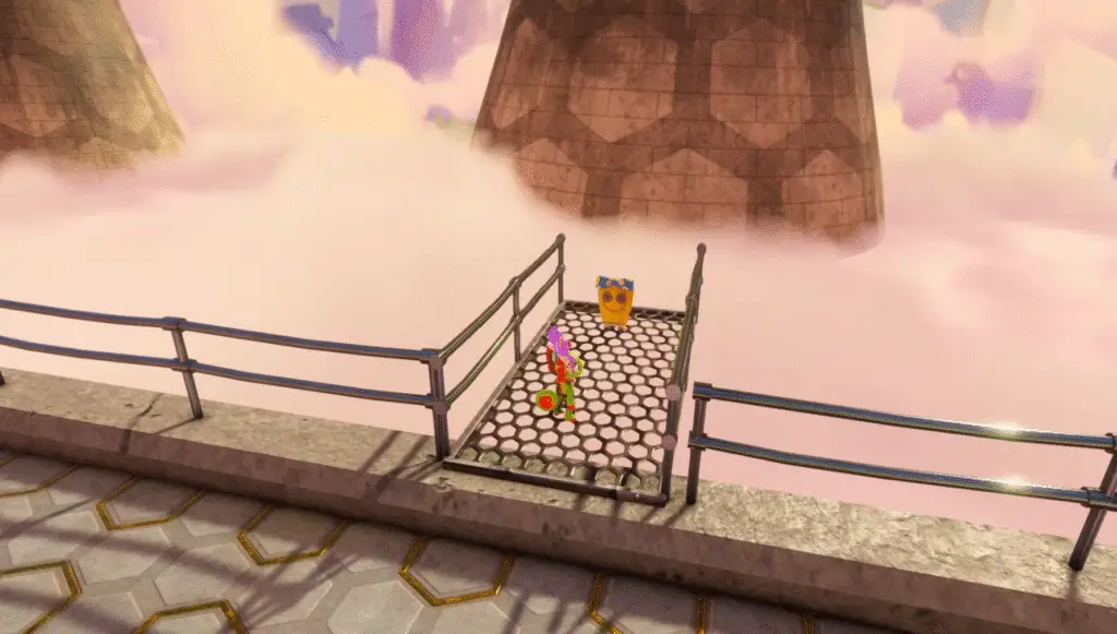 Use Yooka’s charged-up roll to knock the first purple book, causing a domino effect and creating a bridge across to the floating island. Cross the newly constructed bridge and head around to the back.
