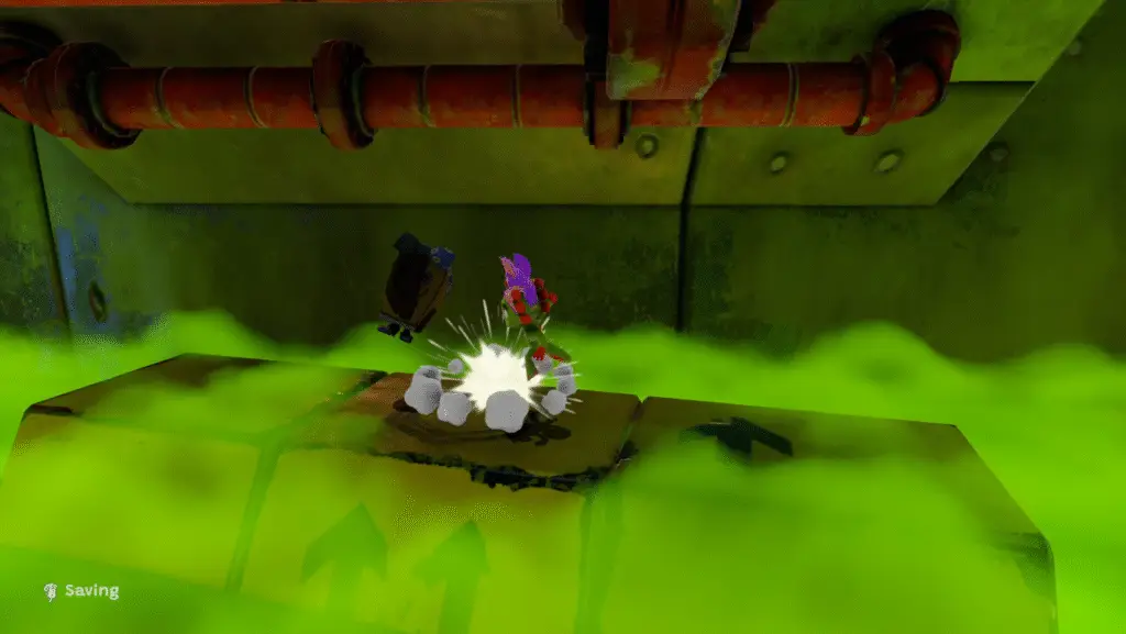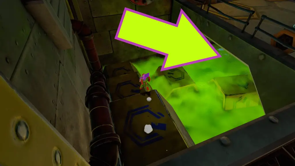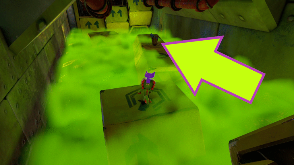 Hop along the barrels under the bridge to see a familiar silhouette in the green mist. It’s our first Vendi statue! Jump over and run into it to kick it. That’s one down, two more to go.
