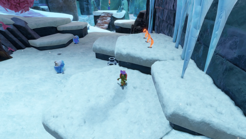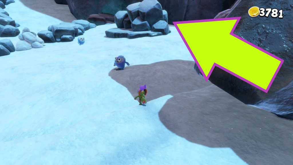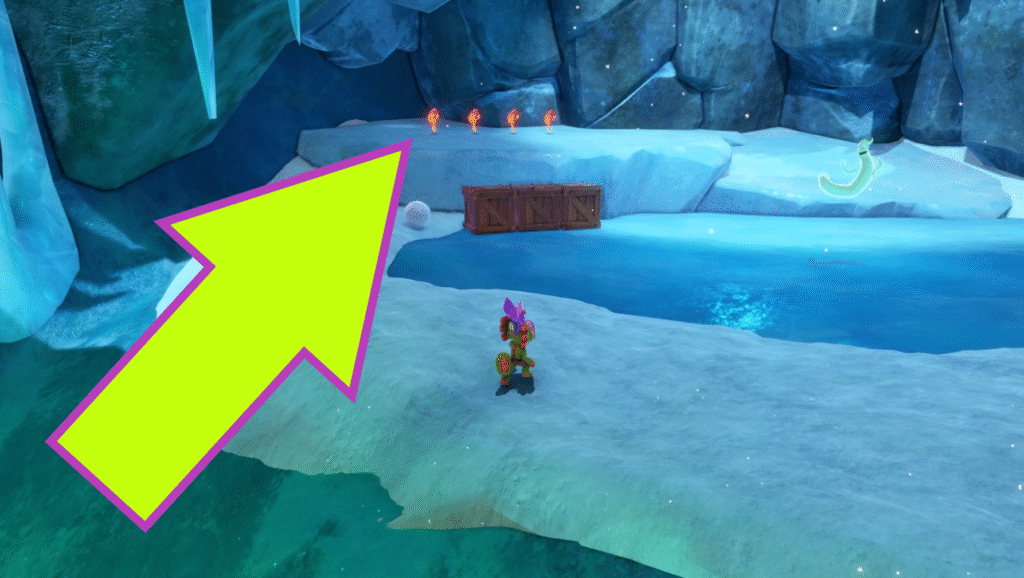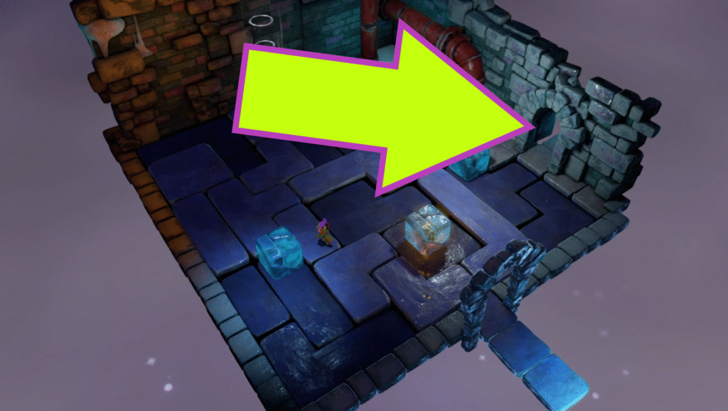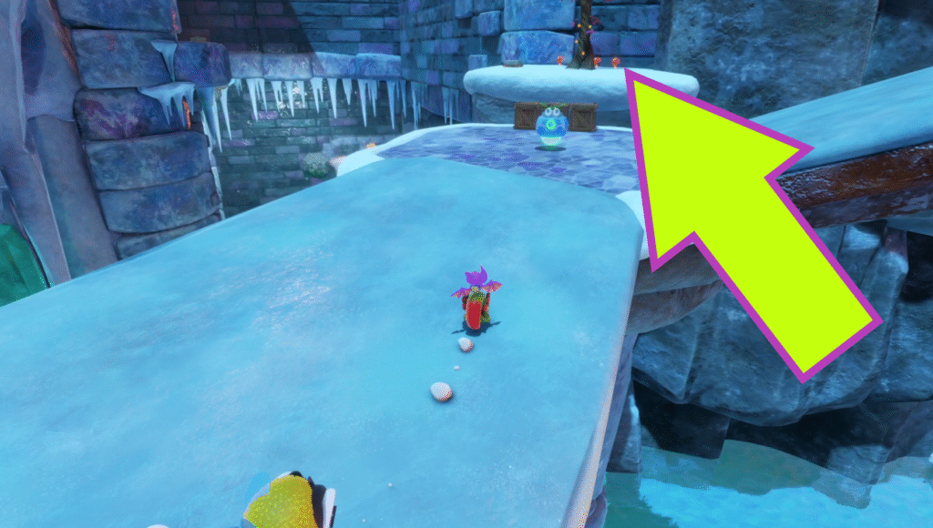 Return to the entrance room of Icymetric Palace and head through the top doorway to a hallway with a couple of Googly Eye enemies. Go through the door opposite the one you came in through, and through a third door in the room with three ice blocks.