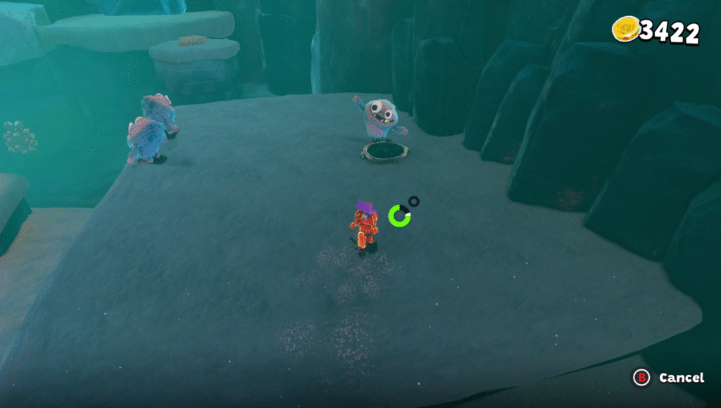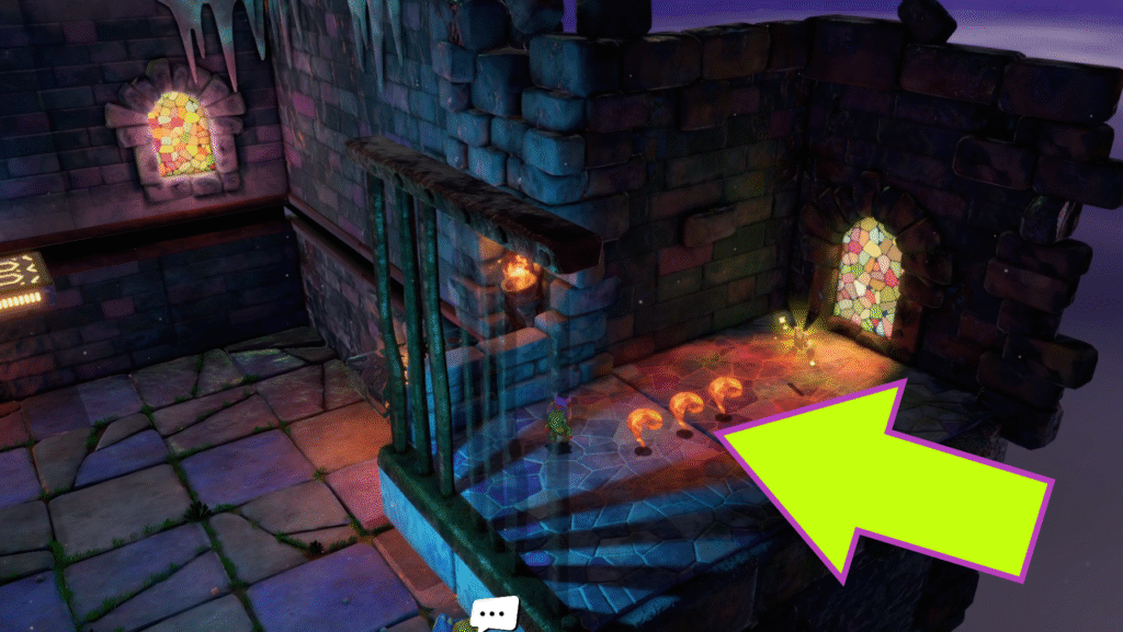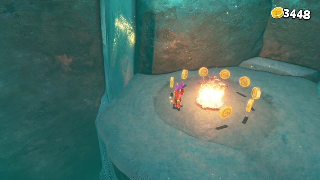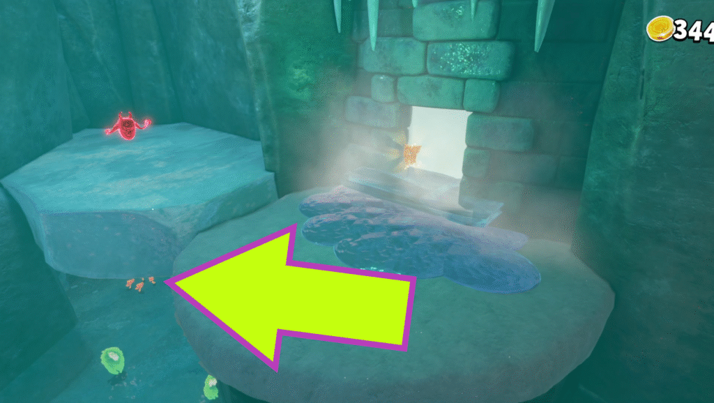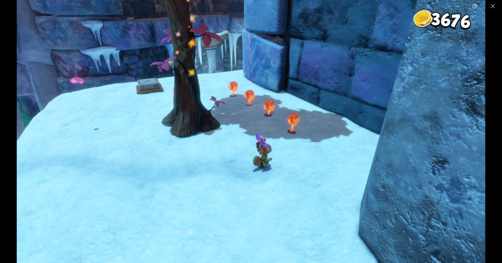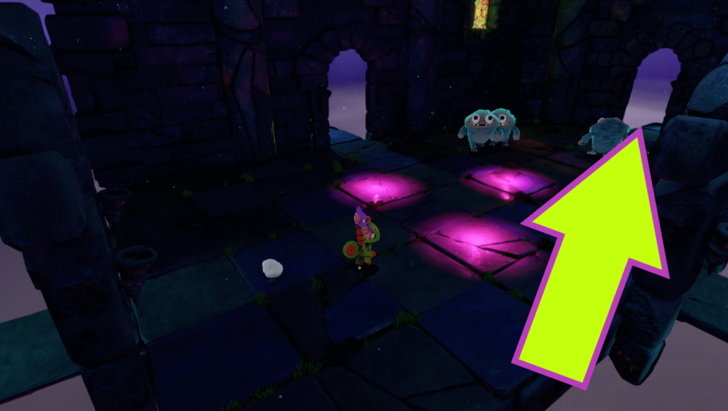 Return to the entrance room of Icymetric Palace and head through the top doorway to a hallway with a couple of Googly Eye enemies. Go through the door opposite the one you came in through, and through a third door in the room with three ice blocks.