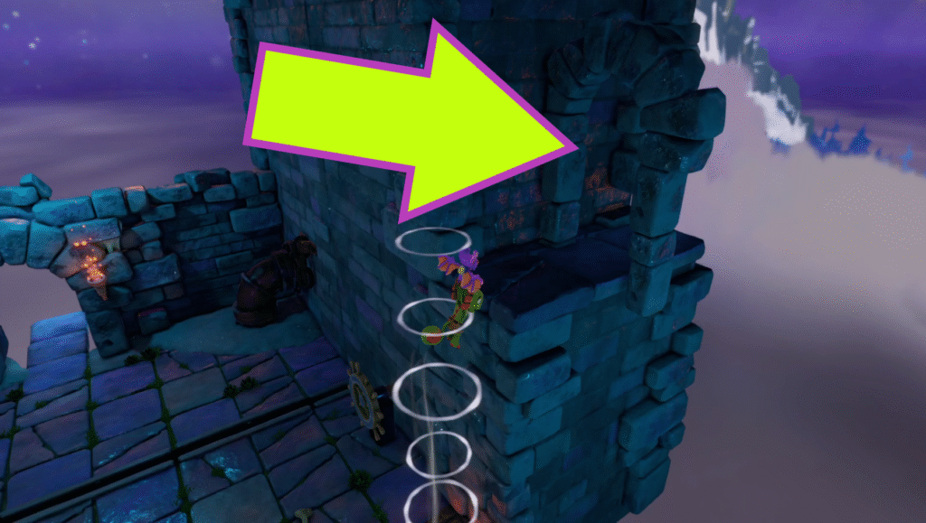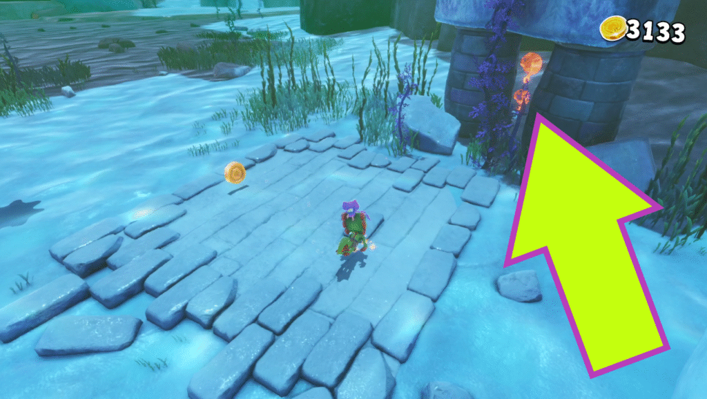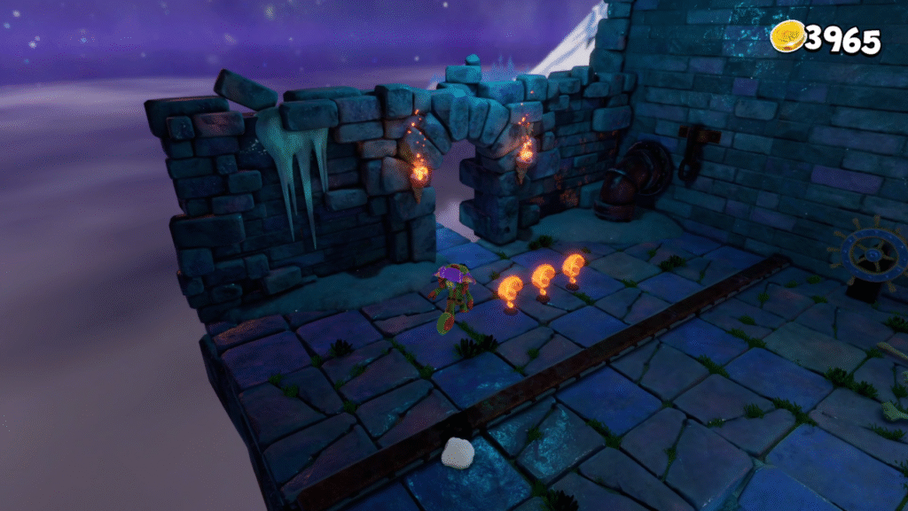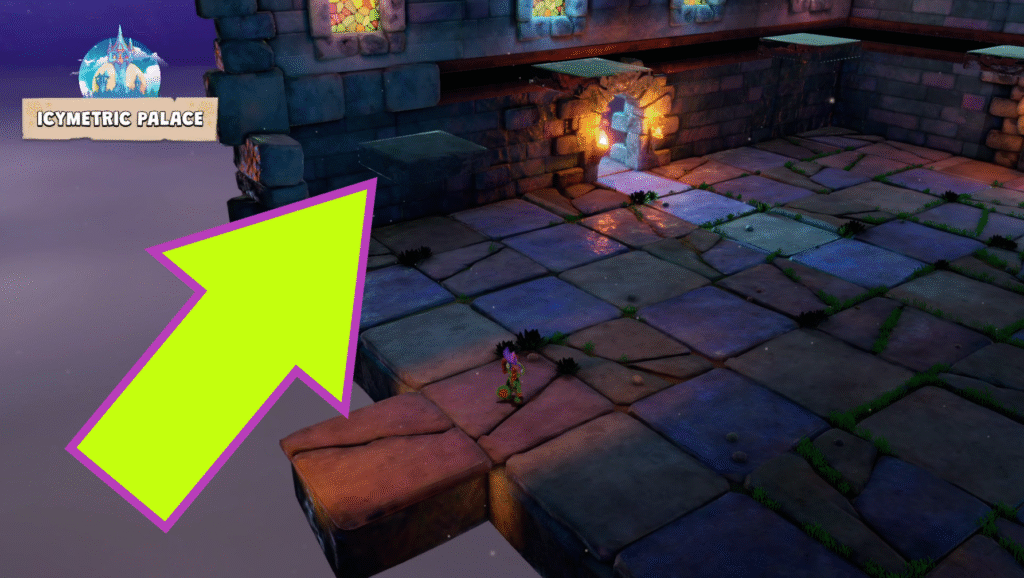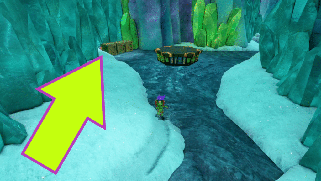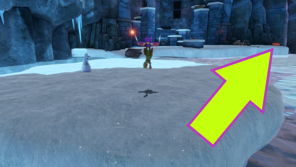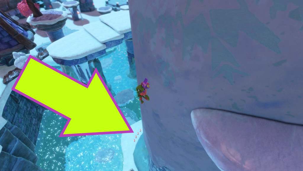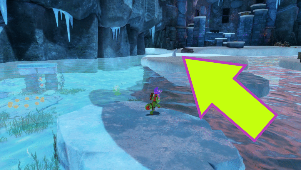 Fast travel back to the Mark at the entrance of Icymetric Palace and grab the vapor from the chest so Yooka and Laylee can fly. Soar around to the West side of the tower, the side of the icy ramp, and look for a snowy outcrop low down near the water. On it are four Quills to retrieve.