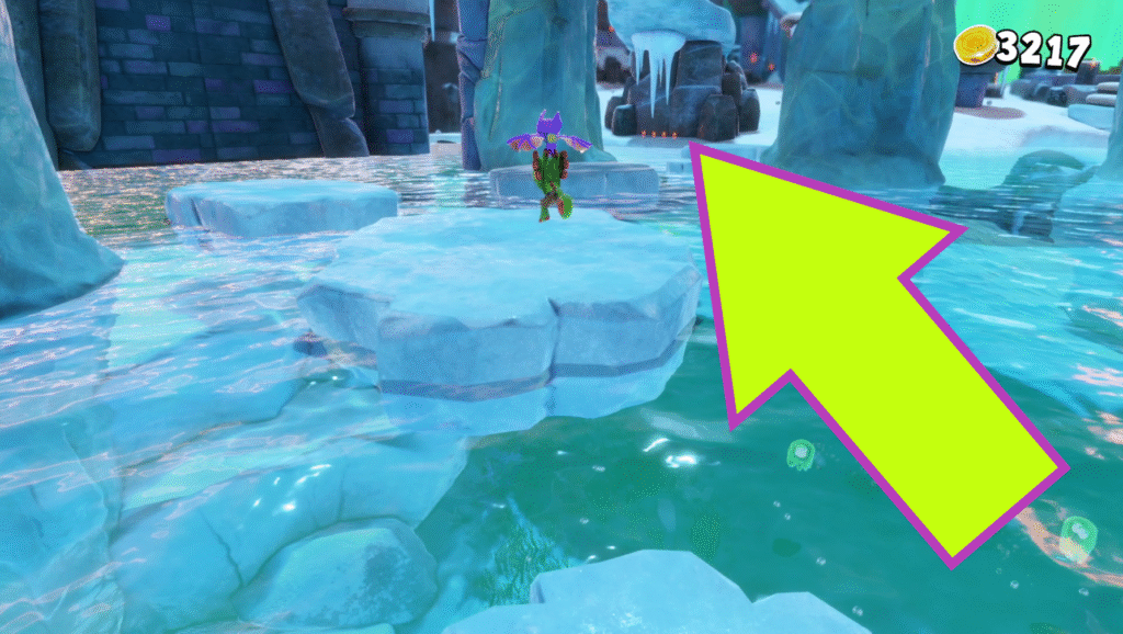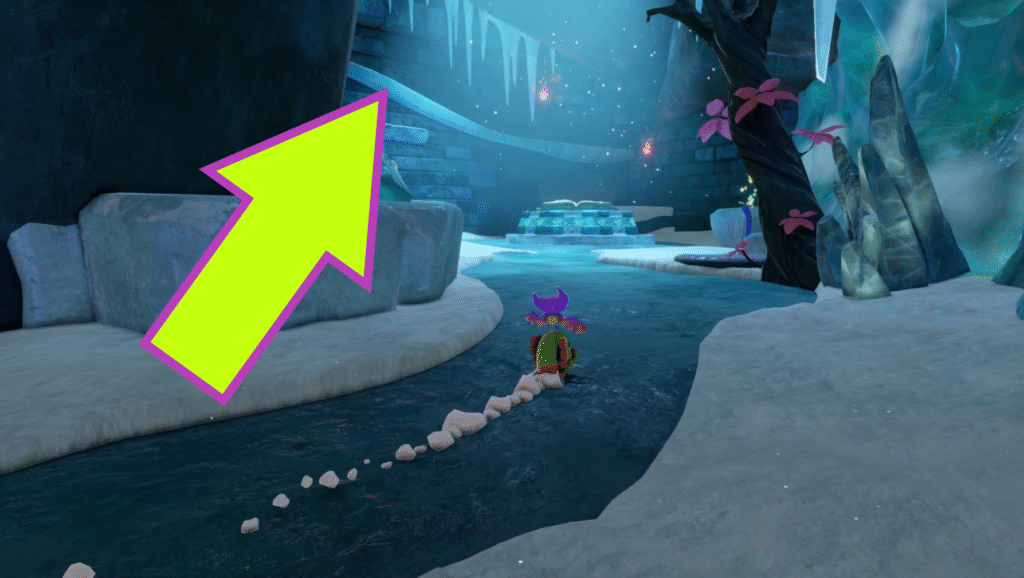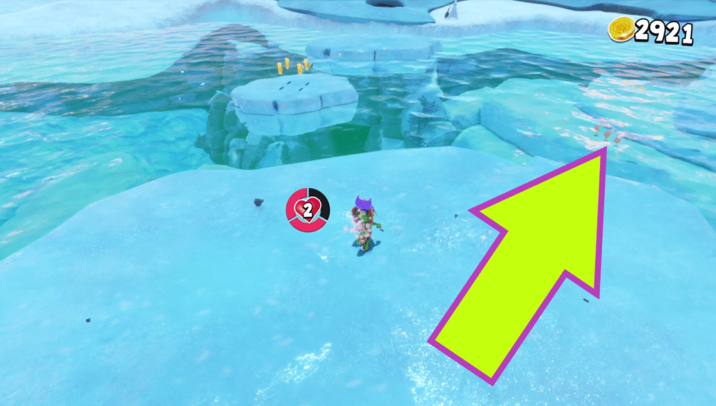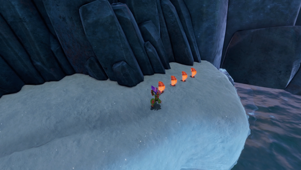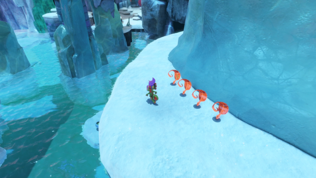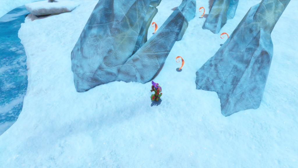 Fast-travel back to the Mark near the beginning of the level, and this time head to the East side of Glitterglaze Glacier. Hop across the floating ice or swim to the shore and grab the four Quills in front of a large rock. You should see them as you approach.