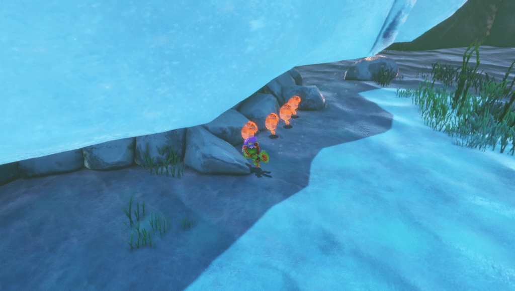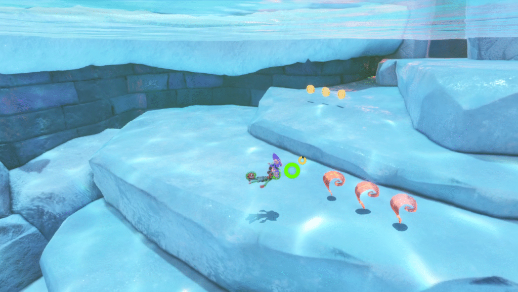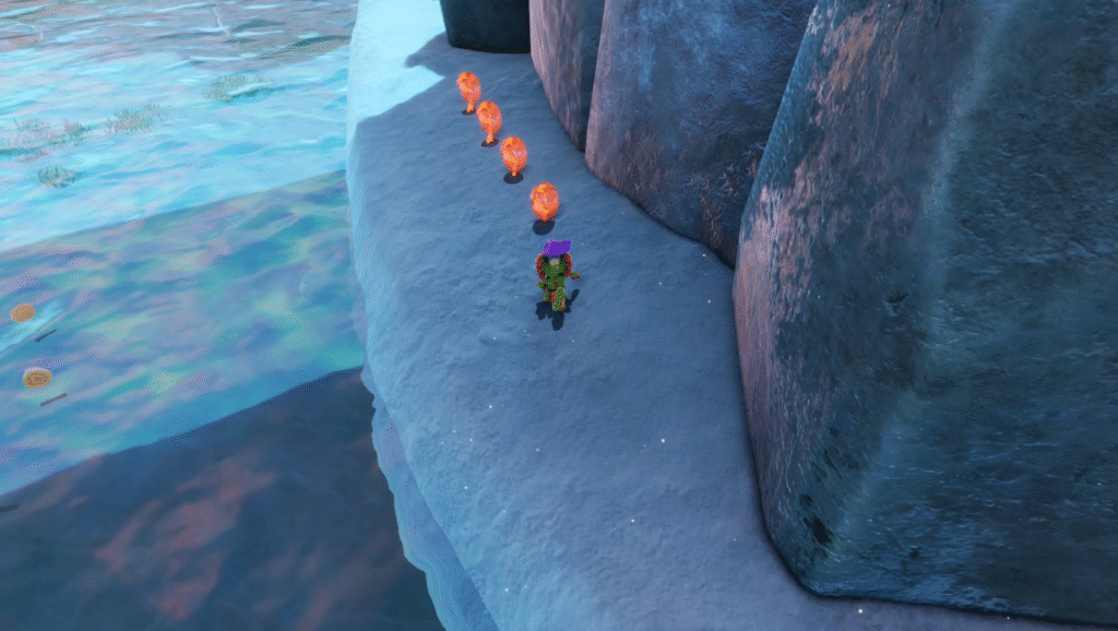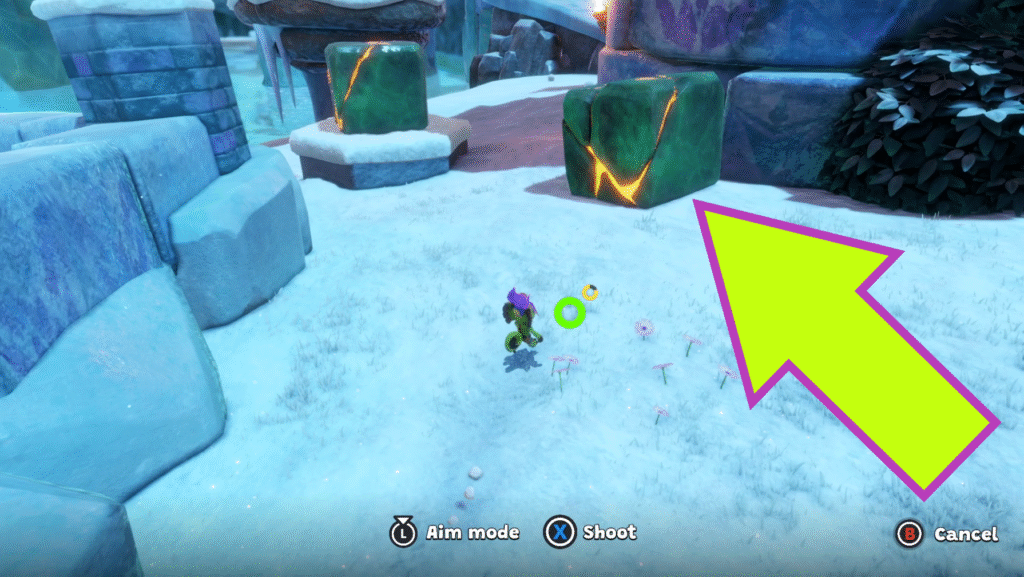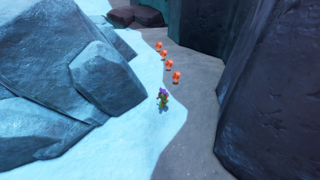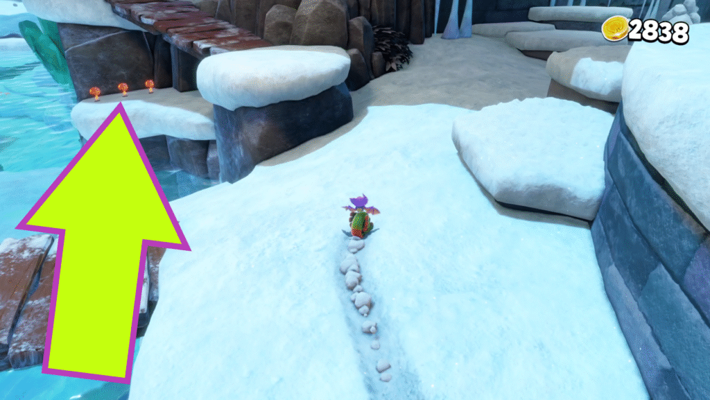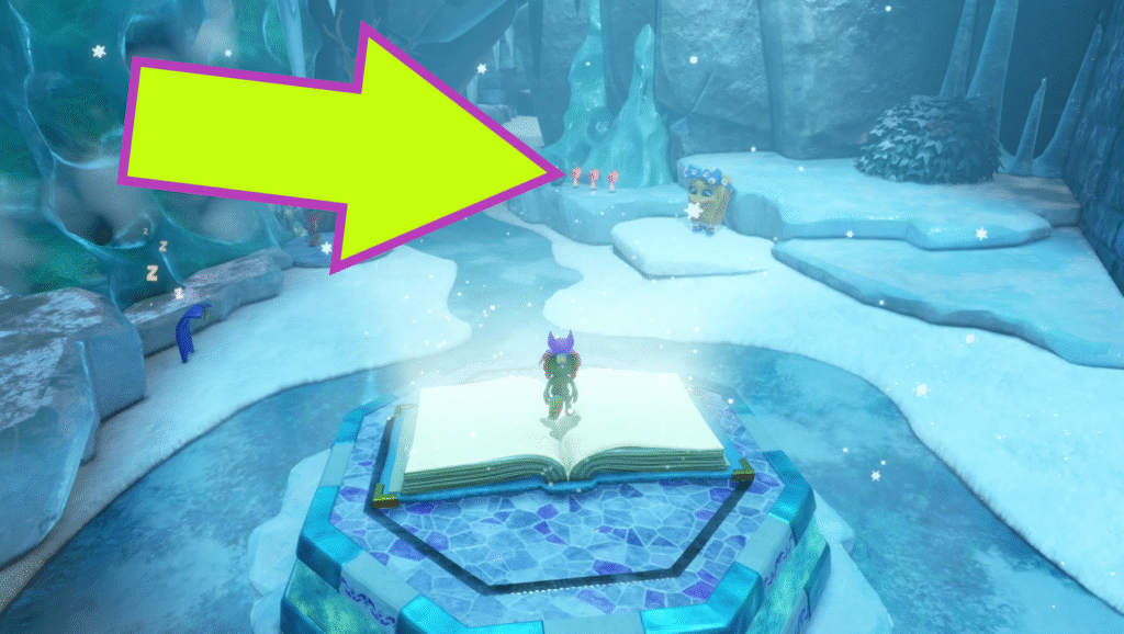 Fast-travel back to the Mark near the beginning of the level, and this time head to the East side of Glitterglaze Glacier. Hop across the floating ice or swim to the shore and grab the four Quills in front of a large rock. You should see them as you approach.