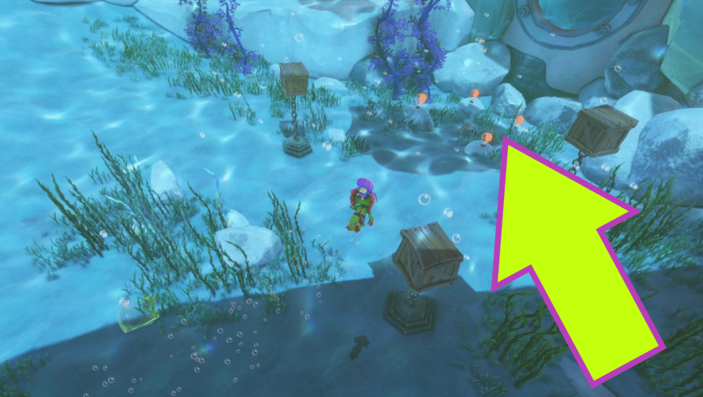 Jump down into the water and look for crates chained down to the waterbed near the tower. Some are in front of the now unblocked pipe, which we will go inside shortly, but first pick up the fur Quills amongst the crates.