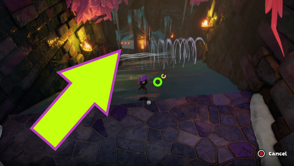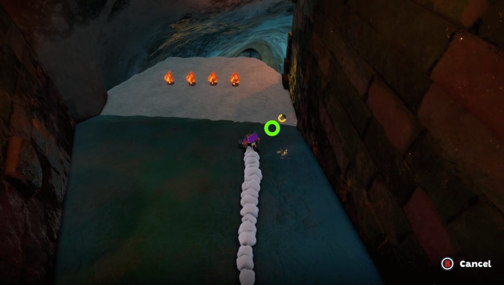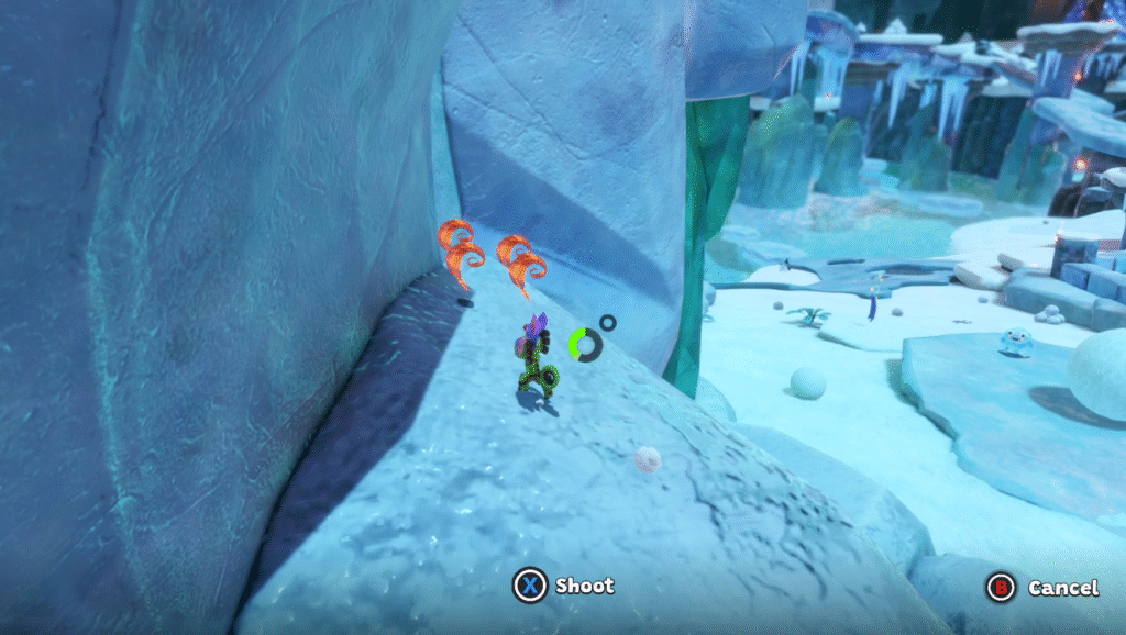 Go up to the top of the icy slope, activate the Mark fast travel point, and enter the Icymetric Palace. In the first room are some invisible platforms you can use after hitting them with Laylee’s Sonar Shot. Ride them around the room to reach a balcony with three Quills on it.