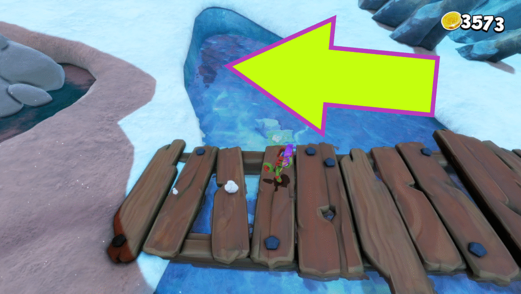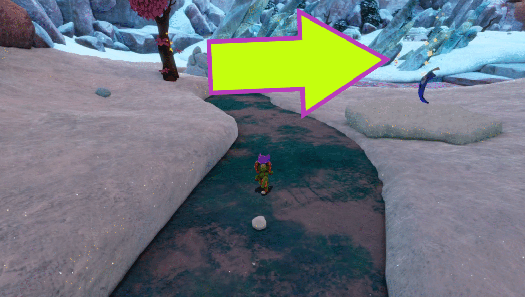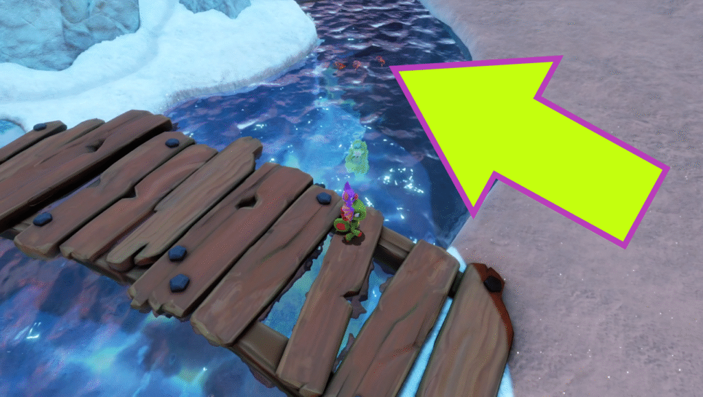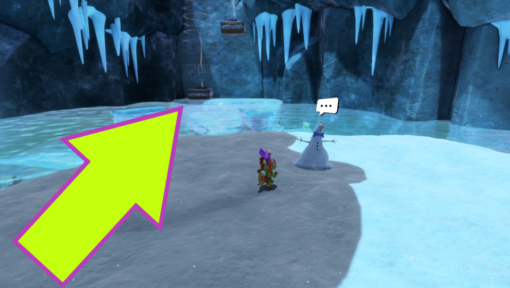 Fast-travel back to the Mark over the wooden bridge and jump down into the water. You want to swim to the West side of Glitterglaze Glacier, towards the high cliff. (to your left when facing the Mark fast travel point from across the wooden bridge). You want to find a snowman standing alone on some ice.
