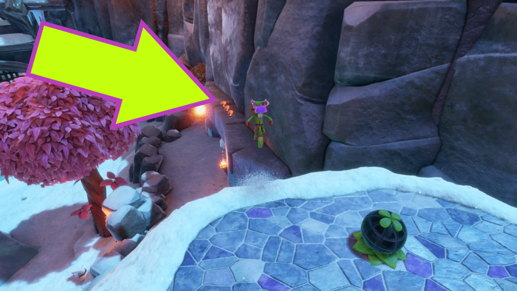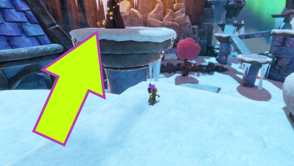 Get back onto the large icy slope and look for a platform on your left with a tree on it. There are four Quills to collect by the tree.