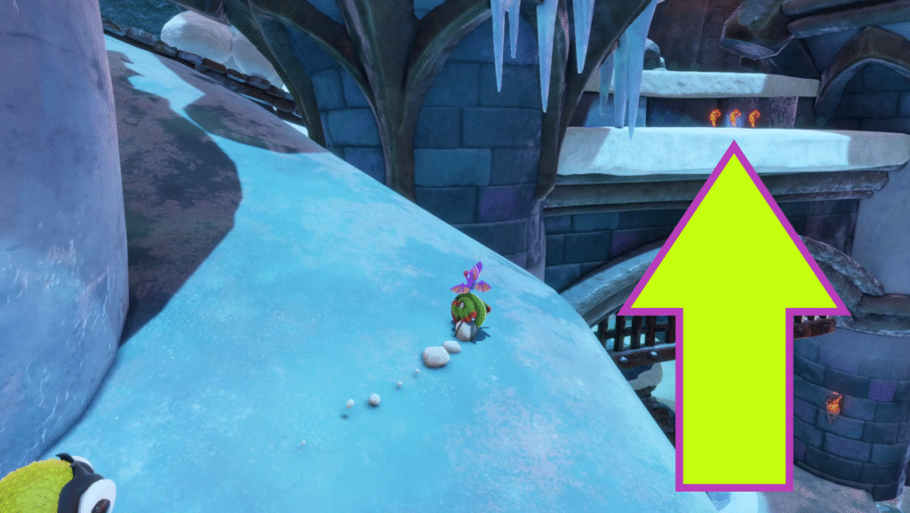Now it is time to roll up the giant ice ramp! As you start your ascent, keep an eye out for a ledge on your right that has three Quills ready to be grabbed.