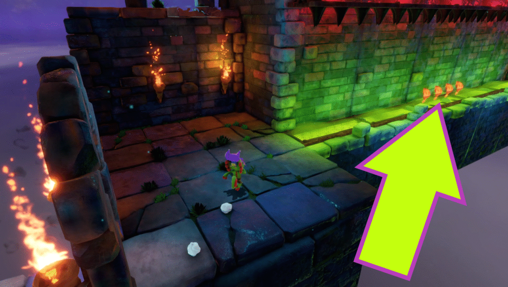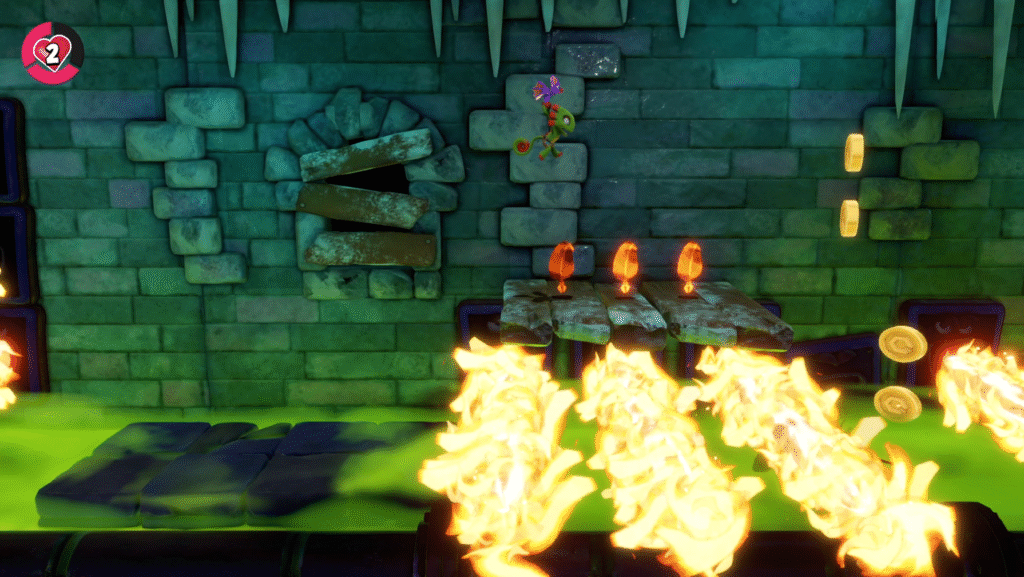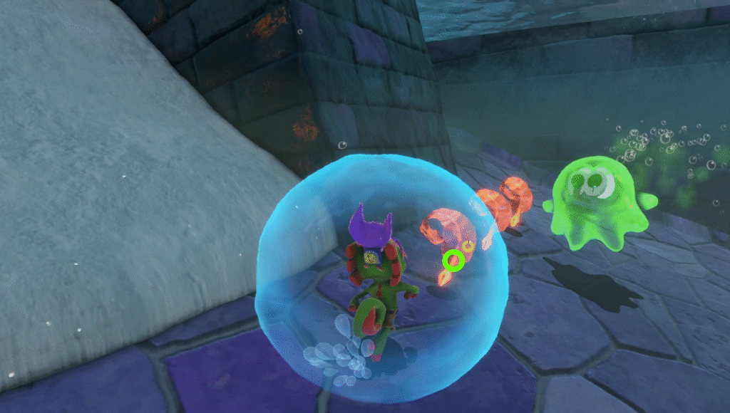 As you enter, there will be a crate with metal balls to your right. Use Yooka’s tongue to pick up the metal state and then slide down the slope, keeping to the left side. The metal state will weigh you down, so the Mr. Blowy enemy can’t push you to the right. You’ll stop at a ledge that has four Quills waiting for you.
