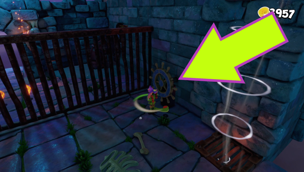 Swim through the other door in the water-filled room, and you’ll end up in a room split by metal bars. Hit the ship’s steering wheel a few times to lower the bars and gain access to three more Quills.
