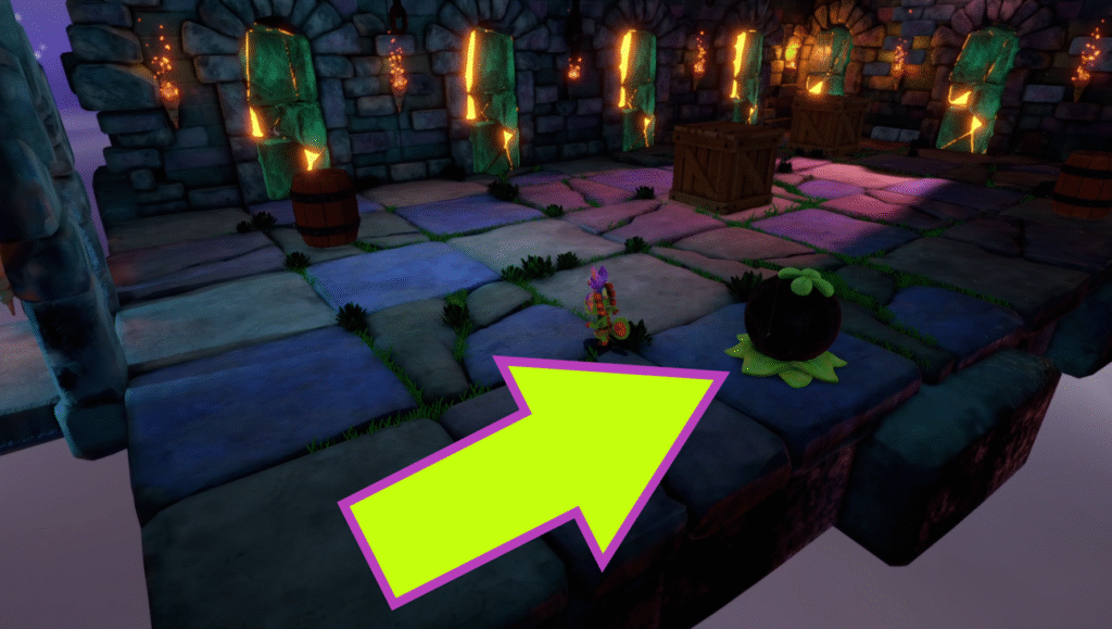 Turn around and walk back across this area and past Dr. Puzz to find a wooden crate on the edge of the level near a large molten block. Smash the crate to reveal a Bomb Plant, which you need the state from. Turn around again to spot a cluster of molten blocks together. Under one of them are four Quills, so spit some bombs to clear the blocks.