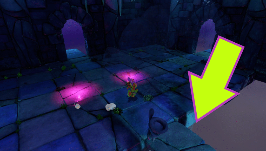 Continue through the door to the right of the obstacle course and cross the room with steam vents and a red Q.U.I.D.D.S challenge. You’ll reach a room with 3 doors and a purple light in the middle of the room. You have to go through the right doorways to reach the last four Quills.